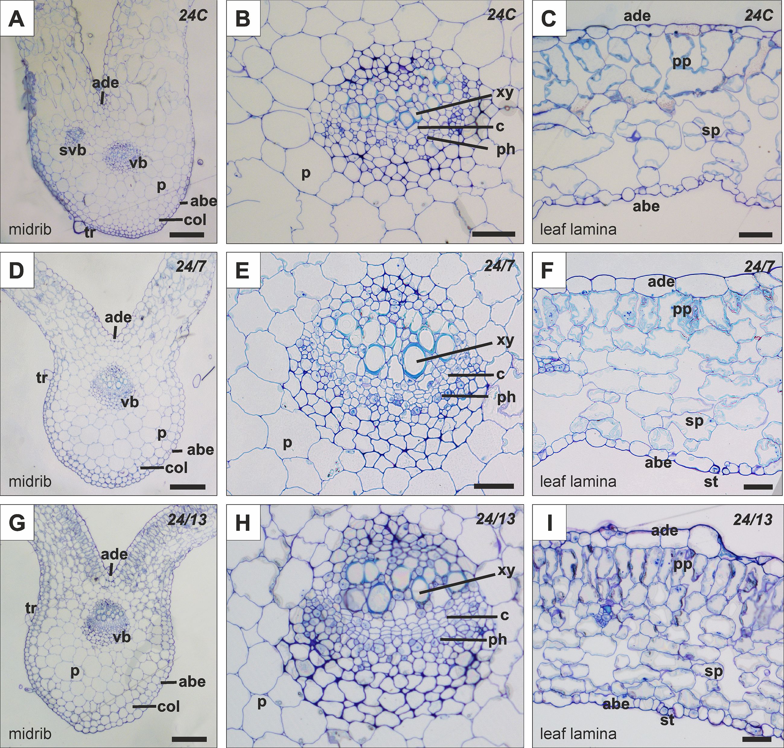 Figure 5. Histology of the leaf lamina and midrib in control 24C (A–C) and tetraploid lines 24/7 (D–F) and 24/13 (G–I); abe – abaxial epidermis, ade – adaxial epidermis, c – cambium, col – collenchyma, p – parenchyma, ph – phloem, pp – palisade parenchyma, sp – spongy parenchyma, st -stomata, svb – secondary vascular bundle, tr – trichome, vb – vascular bundle, xy – xylem. Scale bars (A, D, G) – 200 µm; (B, C, E, F, H, I) – 50 µm.