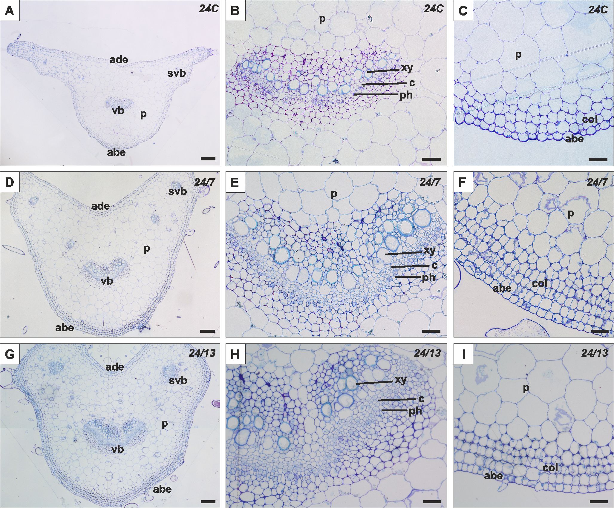 Figure 6. Histology of the petiole in control 24C (A–C) and tetraploid lines 24/7 (D–F) and 24/13 (G–I); abe – abaxial epidermis, ade – adaxial epidermis, c – cambium, col – collenchyma, p – parenchyma, ph – phloem, pp – palisade parenchyma, sp – spongy parenchyma, st -stomata, svb – secondary vascular bundle, vb – vascular bundle, xy – xylem. Scale bars (A, D, G) – 200 µm; (B, C, E, F, H, I) – 50 µm.