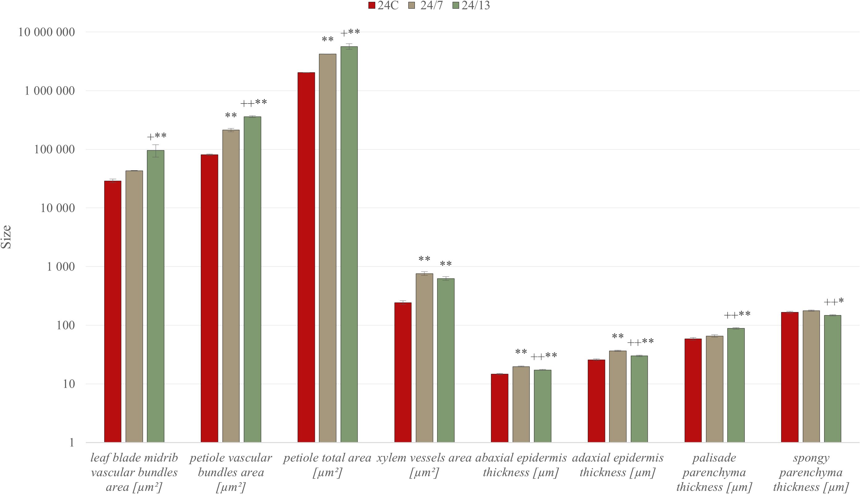 Figure 7. Quantitative anatomical characteristics of diploid and tetraploid Borago officinalis leaves and petioles. Histological measurements were performed on transverse sections of in vitro-grown plants to assess the areas of vascular bundles in the leaf midrib and petiole, total petiole area, xylem vessel area, and the thickness of abaxial and adaxial epidermis, palisade, and spongy parenchyma. Data are presented as mean ± SE. Significant differences are indicated as (p ≤ 0.05 “*”; p ≤ 0.01 “**”) relative to the diploid control (24C), and (p ≤ 0.05 “+”; p ≤ 0.01 “++”) for comparisons between tetraploid lines (24/7 vs 24/13).