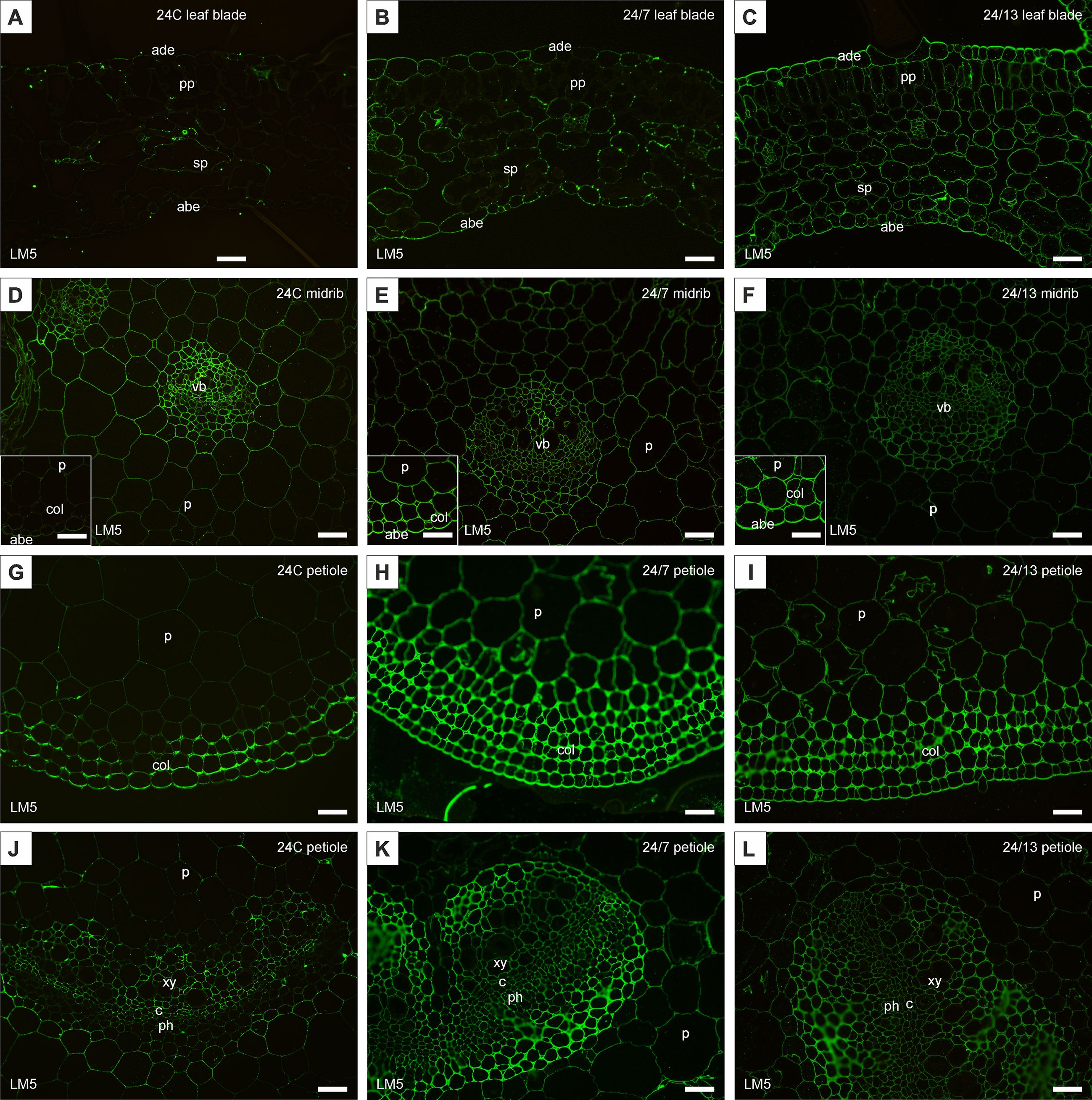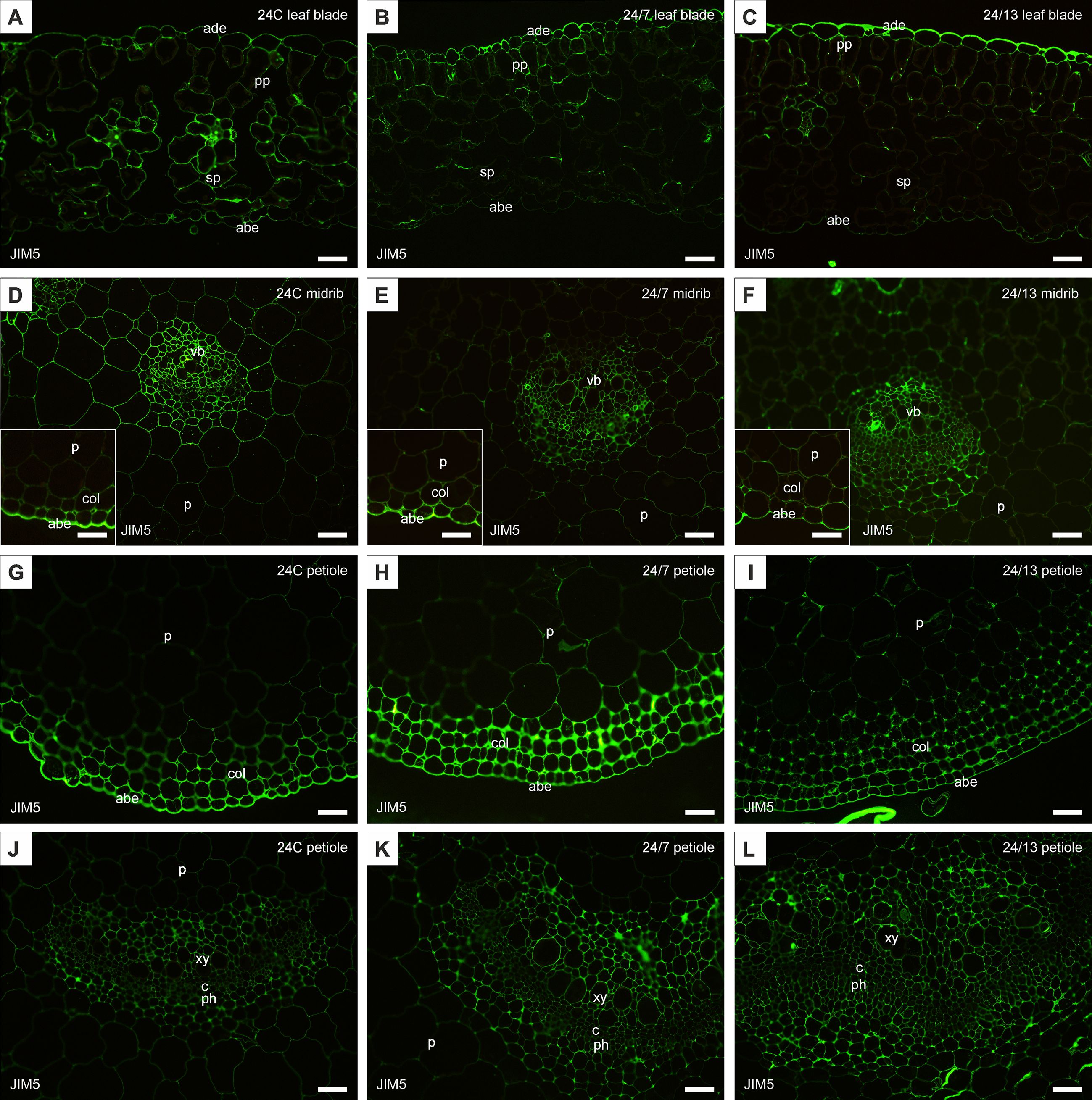 Figure 12. Immunohistochemical localization of LM5 epitope in control 24C (A, D, G, J) and tetraploid lines: 24/7 (B, E, H, K) and 24/13 (C, F, I, L) in the leaf lamina (A–C), midrib (D–F) and petiole (G–L); abe – abaxial epidermis, ade – adaxial epidermis, c – cambium, col – collenchyma, p – parenchyma, ph – phloem, pp – palisade parenchyma, sp – spongy parenchyma, vb – vascular bundle, xy – xylem. Scale bars (A–L), insets (D–F) – 50 µm.