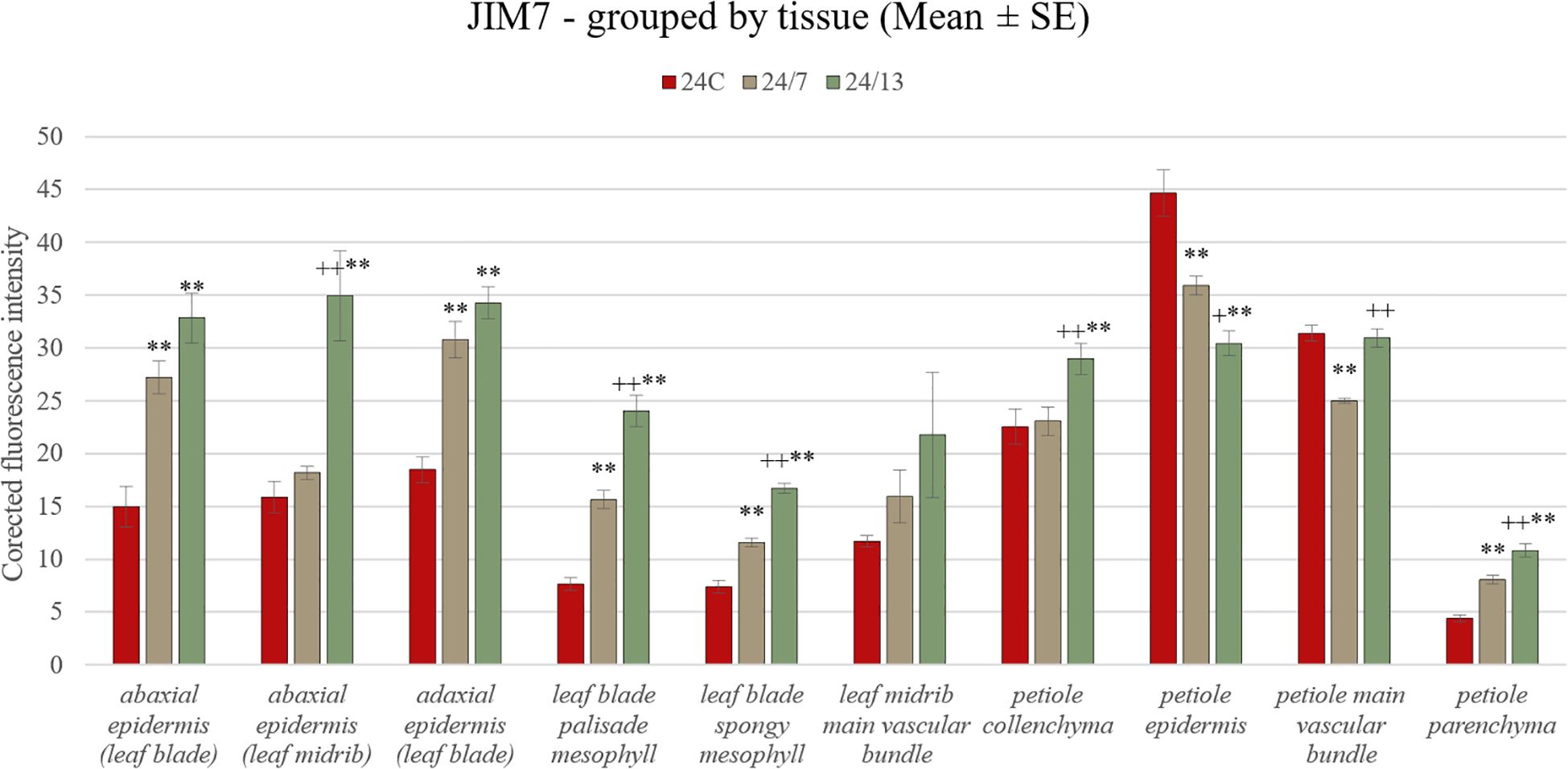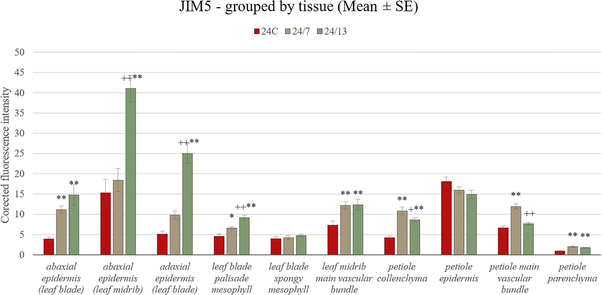 Figure 9. Quantification of JIM5 fluorescence intensity in leaf and petiole tissues of diploid and tetraploid Borago officinalis. Corrected mean ± SE fluorescence intensities were determined for the following tissues: abaxial epidermis (leaf blade), abaxial epidermis (leaf midrib), adaxial epidermis (leaf blade), leaf blade palisade mesophyll, leaf blade spongy mesophyll, leaf midrib main vascular bundle, petiole collenchyma, petiole epidermis, petiole main vascular bundle, and petiole parenchyma. The JIM5 antibody recognizes low-methyl-esterified homogalacturonan. Significant differences are indicated as (p ≤ 0.05 “*”; p ≤ 0.01 “**”) relative to the diploid control (24C), and (p ≤ 0.05 “+”; p ≤ 0.01 “++”) for comparisons between tetraploid lines (24/7 vs 24/13).