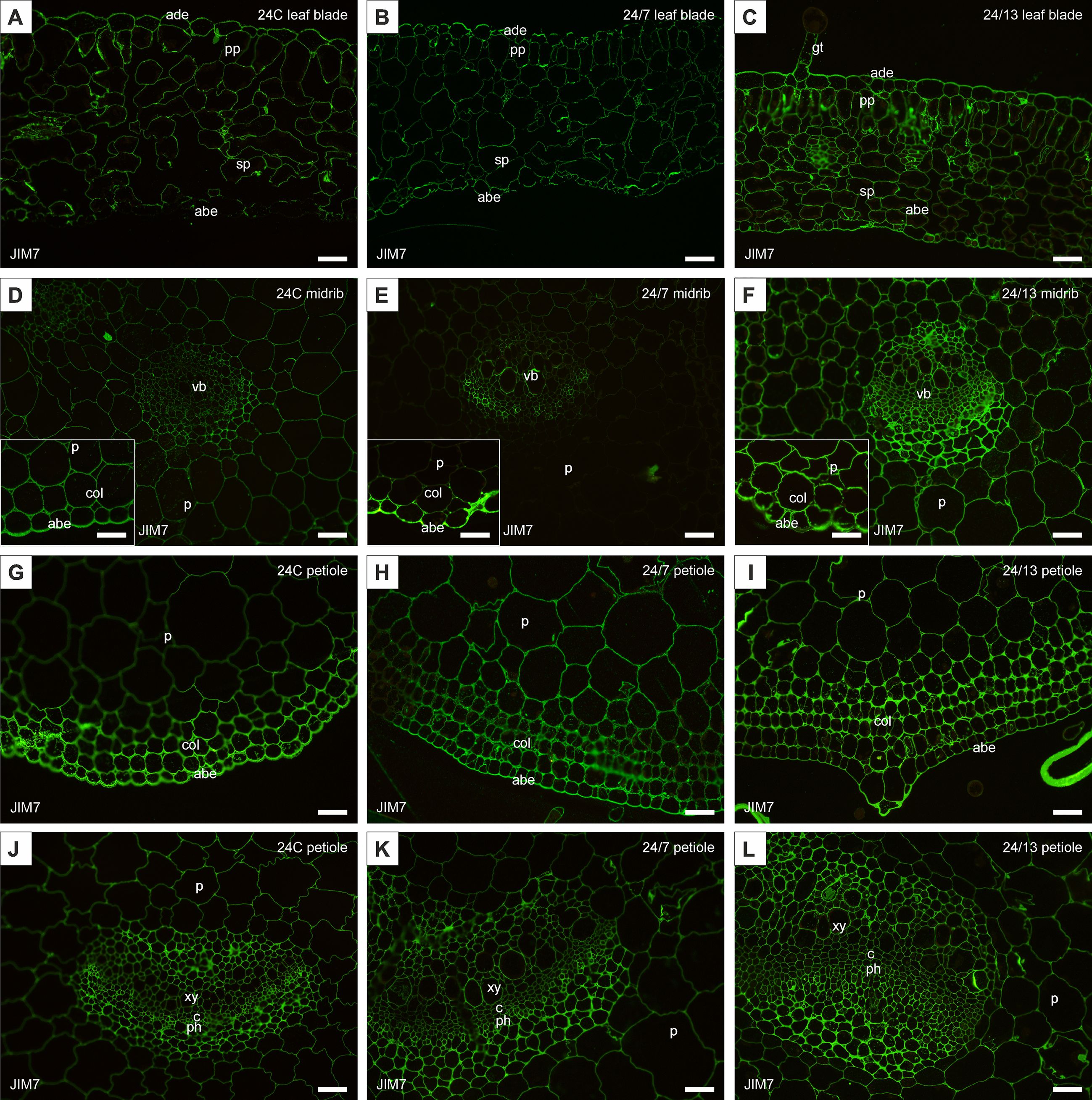 Both palisade (24C 7.1 ± 0.6, 24/7 13.3 ± 1.0, 24/13 21.6 ± 1.4) and spongy mesophyll (24C 6.0 ± 0.5, 24/7 11.4 ± 0.8, 24/13 16.2 ± 1.1) exhibited significant differences between all three lines (p < 0.01), confirming that both tissues follow a line-dependent gradient. In the midrib vascular bundle, JIM7 signal did not differ significantly between lines (p = 0.180), although qualitative observation suggested stronger labelling in 24/13 (Figures 10D–F).