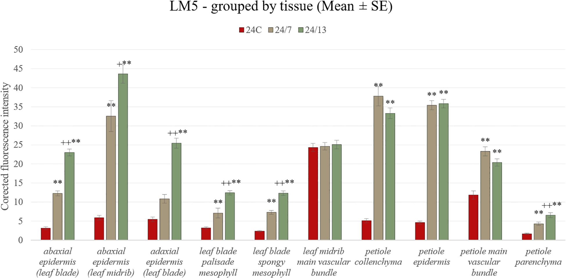 Figure 13. Quantification of LM5 fluorescence intensity in leaf and petiole tissues of diploid and tetraploid Borago officinalis. Corrected mean ± SE fluorescence intensities were determined for abaxial epidermis (leaf blade), abaxial epidermis (leaf midrib), adaxial epidermis (leaf blade), leaf blade palisade mesophyll, leaf blade spongy mesophyll, leaf midrib main vascular bundle, petiole collenchyma, petiole epidermis, petiole main vascular bundle, and petiole parenchyma. The LM5 antibody recognizes (1 → 4)-β-D-galactan side chains of rhamnogalacturonan I. Significant differences are indicated as (p ≤ 0.01 “**”) relative to the diploid control (24C), and (p ≤ 0.05 “+”; p ≤ 0.01 “++”) for comparisons between tetraploid lines (24/7 vs 24/13).