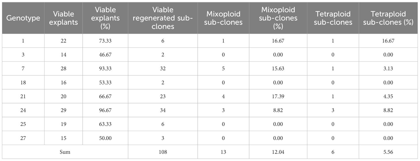Sub-clones regenerated from nodal buds of explants exposed to oryzalin were significantly smaller and slower-growing than controls, often swollen, and showed symptoms of vitrification (hyperhydricity). In contrast, all control explants survived the treatment and regenerated normally. Among the analyzed genotypes, genotype 24 produced the highest number of regenerated sub-clones (34), with three determined as mixoploids and three as tetraploids. Genotype 7 followed with 32 regenerated sub-clones, including five mixoploids and one tetraploid. Genotype 21 yielded 23 regenerated sub-clones, of which four were mixoploid and one was tetraploid. Genotype 1 had six regenerated sub-clones, with one identified as mixoploid and one as tetraploid. Other genotypes (3, 18, 25, and 27) did not produce any confirmed tetraploid subclone.