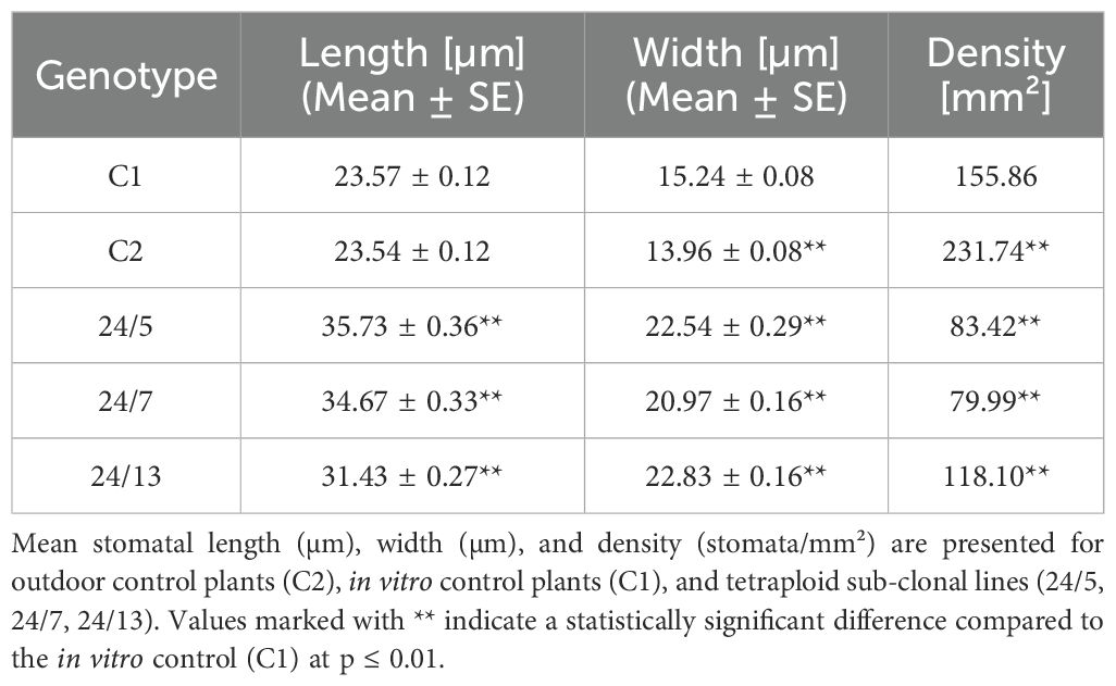 Stomatal density was highest in the outdoor control plants (C2), at 231.74 stomata/mm², compared to 155.86 stomata/mm² in the in vitro control (C1). Tetraploid sub-clonal lines showed a significantly reduced stomatal density, with values of 83.42/mm² (24/5), 79.99/mm² (24/7), and 118.1/mm² (24/13), indicating a trade-off between increased stomatal size and decreased density.