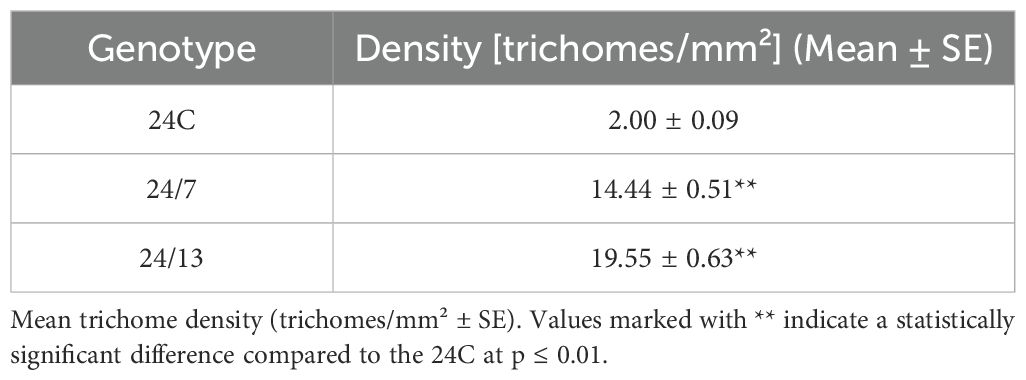 Quantitative evaluation of abaxial trichome density revealed marked differences between the control and tetraploid lines (Table 4). The abaxial leaf surface of the in vitro control plants (24C) exhibited a relatively sparse indumentum, with a mean trichome density of 2.00 ± 0.09 trichome/mm². In contrast, the tetraploid sub-clonal lines displayed a substantially higher density of trichomes. Line 24/7 reached an average of 14.44 ± 0.51 trichome/mm², whereas line 24/13 attained the highest value of 19.55 ± 0.63 trichome/mm² (p ≤ 0.01). The increase in trichome number was visually apparent under stereomicroscopy, with tetraploid leaves exhibiting a denser and more uniform indumentum, particularly along the interveinal regions of the abaxial surface.
