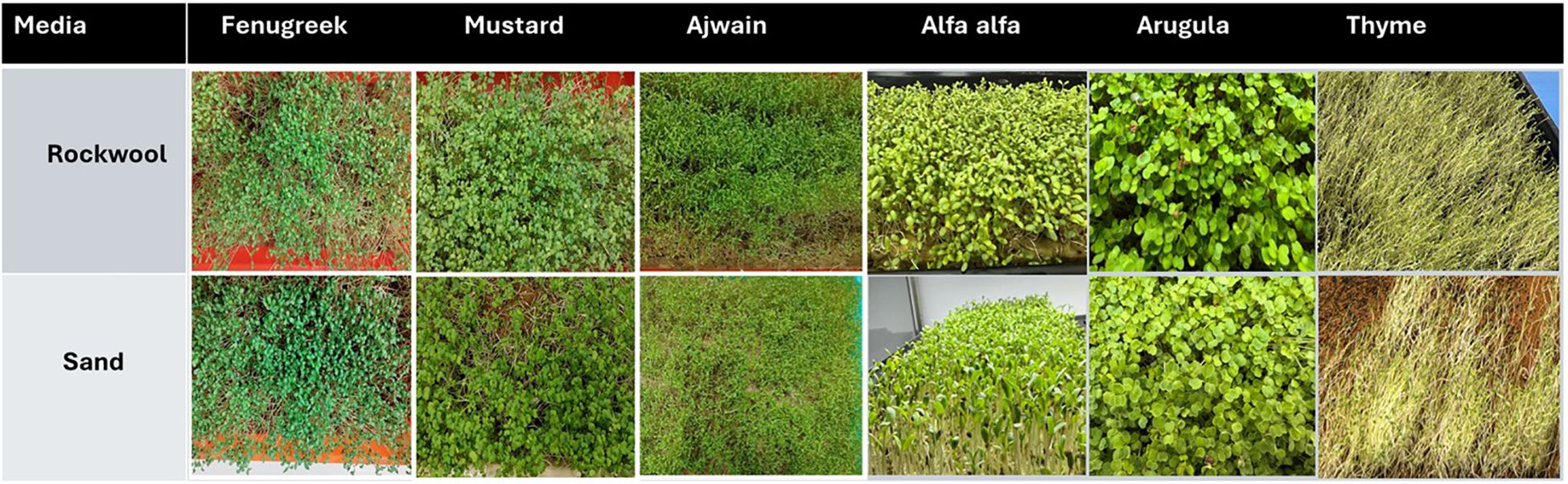 In arid regions, desert sand, despite its low nutrient content, presents a potentially cost-effective and environmentally sustainable alternative medium for cultivating microgreens.This is largely because the inherent nutritional reserves within microgreen seeds often minimize or eliminate the need for additional fertilizers during production (Sangwan et al., 2022). Limited experimental evidenceexists to supportthe use of desert sand as a growth substrate for microgreens. The present study investigates the cultivation of six microgreen species—Fenugreek (Trigonella foenum-graecum L.), Mustard (Brassica juncea L.), Ajwain (Trachyspermum ammi L.), Alfalfa (Medicago sativa L.), Arugula (Eruca sativa L.), and Thyme (Thymus vulgaris L.)—using desert sand, to evaluate its feasibility. The primary objective was to compare growth parameters, yield, and nutritional quality of microgreens grown in desert sand with those cultivated in a conventional substrate such as rockwool.