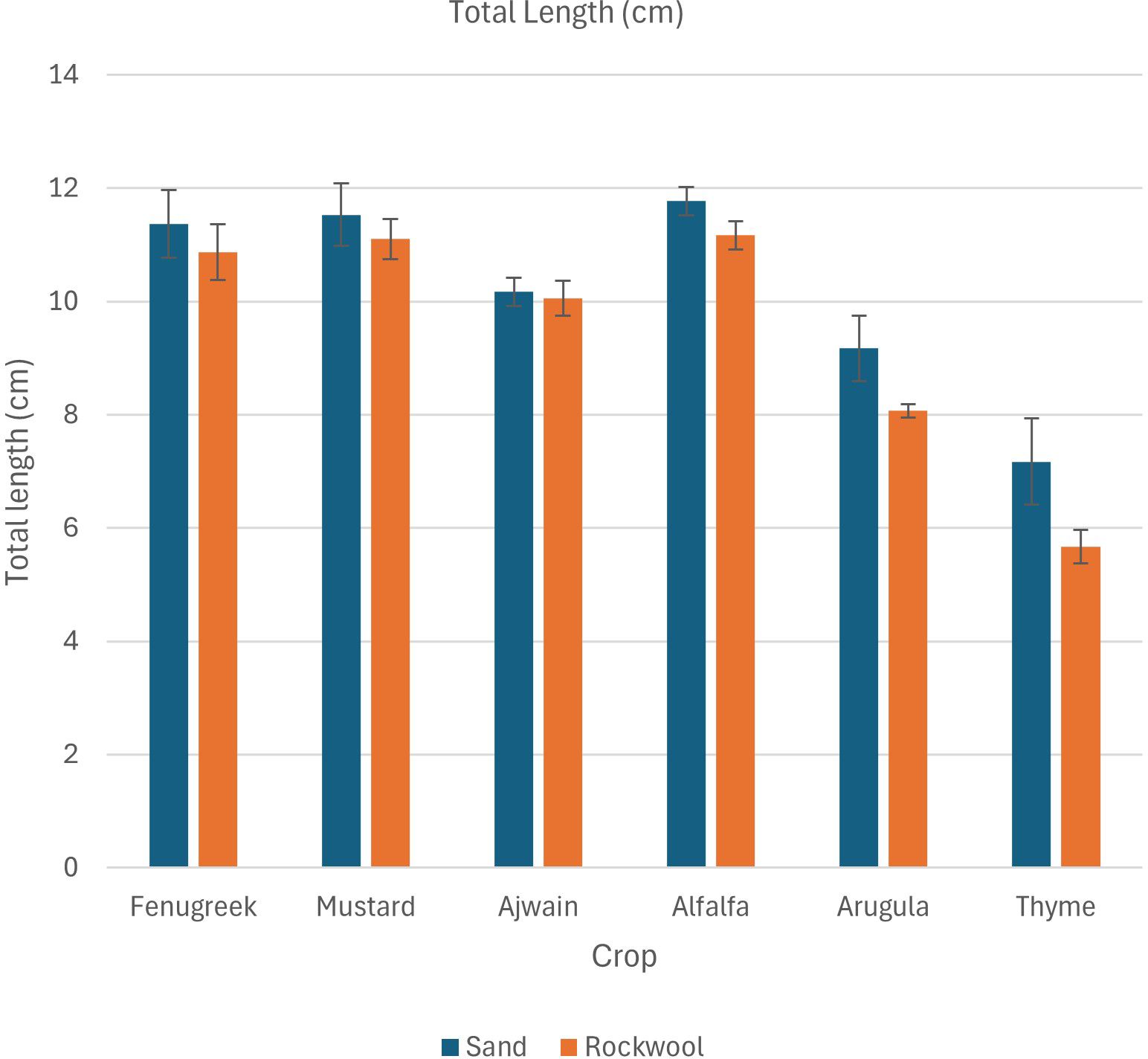 Figure 2. Total length (cm) of different microgreen species in sand and rockwool media. ANOVA with Tukey’s post hoc test was performed (p < 0.05). Different superscripts indicate significant differences; absence of superscripts indicates no significant differences.