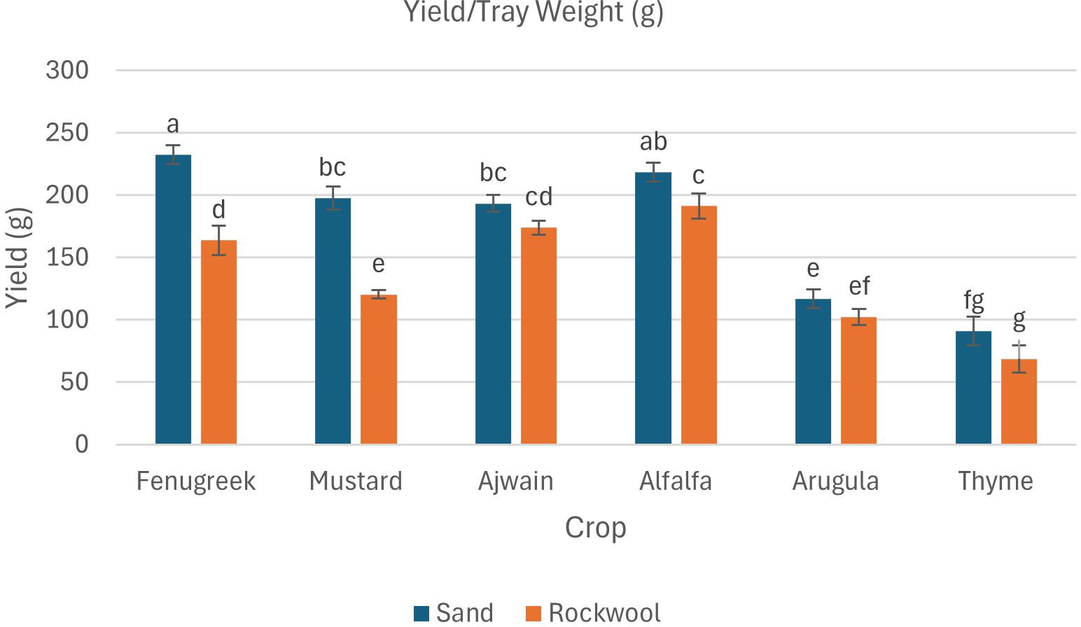 Figure 3. Yield/tray fresh weight (g) of different microgreen species under sand and rockwool media. ANOVA with Tukey’s post hoc test was performed (p < 0.05). Different superscripts indicate significant differences; absence of superscripts indicates no significant differences.
