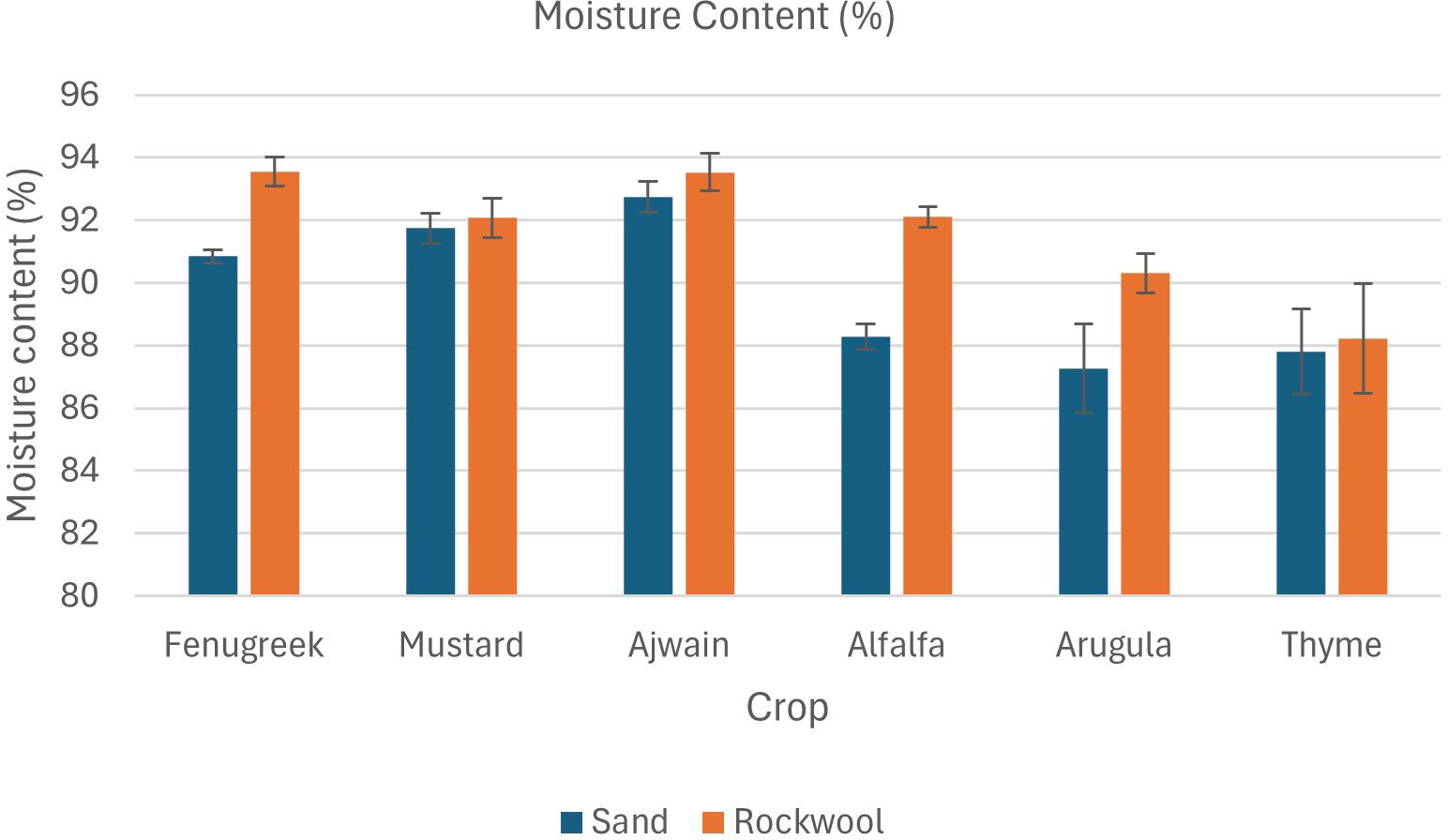 Figure 4. Moisture content (%) of microgreens as influenced by sand and rockwool growth media. ANOVA with Tukey’s post hoc test was performed (p < 0.05). Different superscripts indicate significant differences; absence of superscripts indicates no significant differences.
