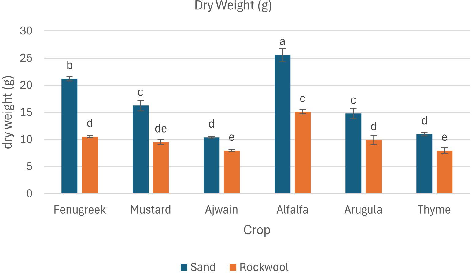 Figure 5. Dry weight (g) of different microgreen species under sand and rockwool media. ANOVA with Tukey’s post hoc test was performed (p < 0.05). Different superscripts indicate significant differences; absence of superscripts indicates no significant differences.