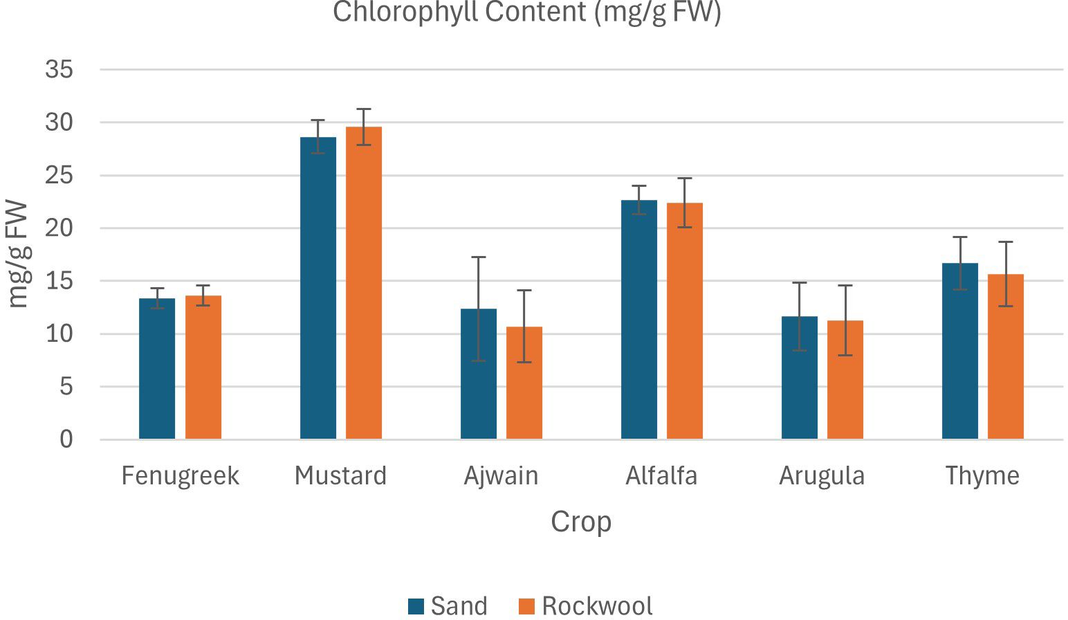 Microgreens have been widely studied due to their rich content of vitamins, minerals, and phytochemicals (Lone and Pandey, 2024). In this experiment, all microgreens showed a satisfactory level of phytochemical content with microgreens in sand yielding comparable or slightly higher phytochemical contents compared to rockwool. CChlorophyll content, important for both health benefits and visual appeal, influences consumer acceptance, particularly for color-valued microgreens (Bulgari et al., 2017; Yadav et al., 2019). High chlorophyll levels also highlight their potential as a functional food (Fabek Uher et al., 2023). Among the six microgreen species, mustard consistently exhibited the highest chlorophyll content across both sand and rockwool substrates, indicating its strong photosynthetic capacity and stable chlorophyll synthesis regardless of growth medium. This might be due to the enhanced light capture and energy conversion, highlighting their efficient photosynthetic activity (Ahmed et al., 2025). In contrast, ajwa in microgreens displayed a more pronounced difference in the chlorophyll content between sand and rockwool, indicating a potentially greater sensitivity to substrate variations. This revealed that each microgreen species has unique physiological responses to different growth media. The minor differences in chlorophyll content between sand-grown and rockwool-grown microgreens in fenugreek, alfalfa and arugula suggests that the substrate had minimal influence on chlorophyll synthesis in this species. Chlorophyll synthesis may also be affected by other environmental factors such as temperature, light intensity, water availability (Tripathy and Dalal, 2013). Varying responses of microgreens emphasize the need for further investigation into the specific dynamics between plants and different growth media.
