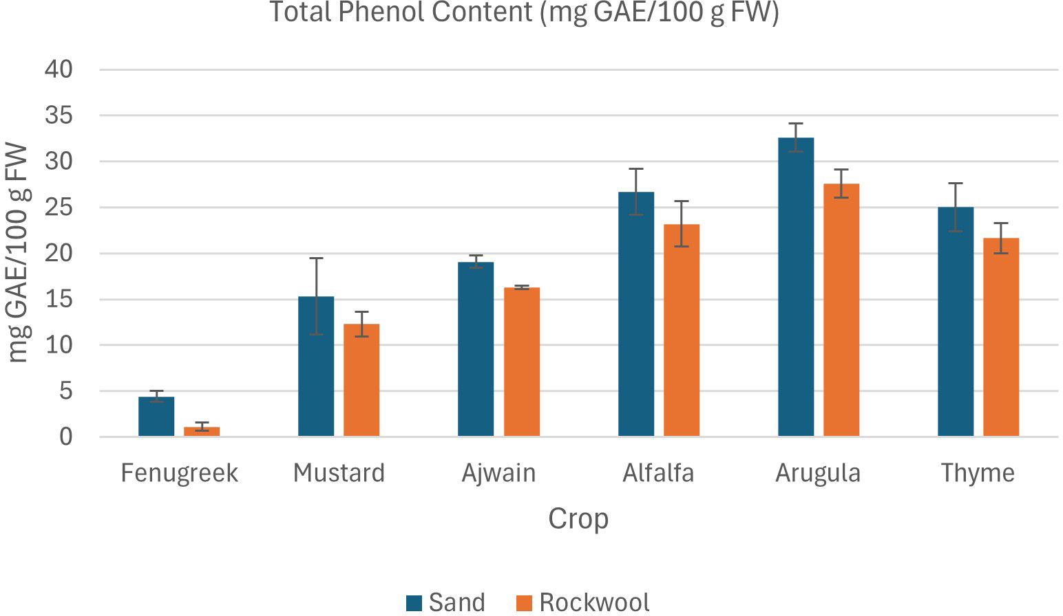 Microgreens cultivated in sand demonstrated significantly higher total phenol content in comparison to those cultivated in rockwool (Figure 7). Among the crops, arugula consistently exhibited the highest phenol content (32.60 mg GAE/100 g) across both media types, while fenugreek displayed the lowest values rockwool (1.10 mg GAE/100 g), particularly in rockwool. Other crops, such as mustard and thyme, showed relatively consistent phenol levels, but still exhibited higher values in sand compared to rockwool. The findings show that crop species and the type of media (sand vs. rockwool) both had a notable impact on phenol content. The consistently elevated phenol content in sand-grown microgreens shows the potential of desert sand as a promising substrate for enhancing the nutraceutical quality of microgreens.