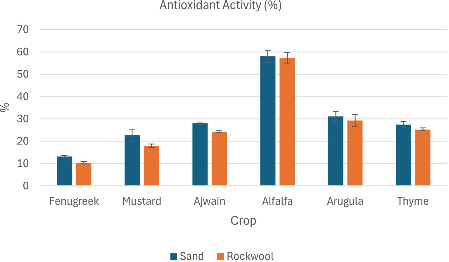 Microgreens are abundant in antioxidants like glucosinolates and phenolic compounds, which are associated with numerous health benefits. Research has shown that these compounds can help boost the immune system, particularly in the prevention of illnesses like COVID-19 (Tallei et al., 2024; Rohmanna et al., 2023). The antioxidant content of microgreens can vary based on factors such as species, growing conditions, and harvesting time (Tallei et al., 2024). Studies by Ghoora et al. (2020) and Dhaka et al. (2023) reported high values of DPPH activity in microgreens. The antioxidant potential was examined in terms of radical scavenging activity (DPPH). In the DPPH assay, free radicals containing DPPH react with sample antioxidants. The antioxidants then reduce the DPPH molecule by donating a hydrogen atom (Senevirathne et al., 2019). Microgreens cultivated in sand exhibited elevated total antioxidant content compared to those in rockwool. This might be due to the effect of salinity from sand on antioxidant properties of microgreens. According to Islam et al. (2019), moderate salinity levels improved antioxidants in microgreens. Among the microgreens, alfalfa had the highest antioxidant content in sand, while fenugreek exhibited the lowest antioxidant content when grown in rockwool. This indicated potential differences in antioxidant metabolism and accumulation among microgreen species in response to different growth substrates. Antioxidant content of microgreens also depends on plant species, light exposure, salinity stress and the harvesting time (Islam et al., 2019; Mlinaric et al., 2020; Tallei et al., 2024).