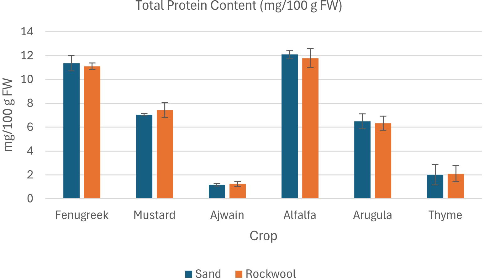 Alfalfa and fenugreek microgreens demonstrated consistent total protein levels across both sand and rockwool substrates as the microgreens from Fabaceae family are generally rich in protein (Kowitcharoen et al., 2021). Fenugreek possesses inherent physiological mechanisms that enable stable protein biosynthesis regardless of the growth medium resulting in higher protein content. The detected values for fenugreek were higher than the values reported by Ghoora et al. (2020). The variation in the protein content of other microgreen species maybe from species-specific responses to distinct growth media, indicating differential nutrient uptake and utilization pathways among microgreen species. These findings suggest that substrate composition may influence protein accumulation in microgreens, to a lesser extent compared to species-specific factors.