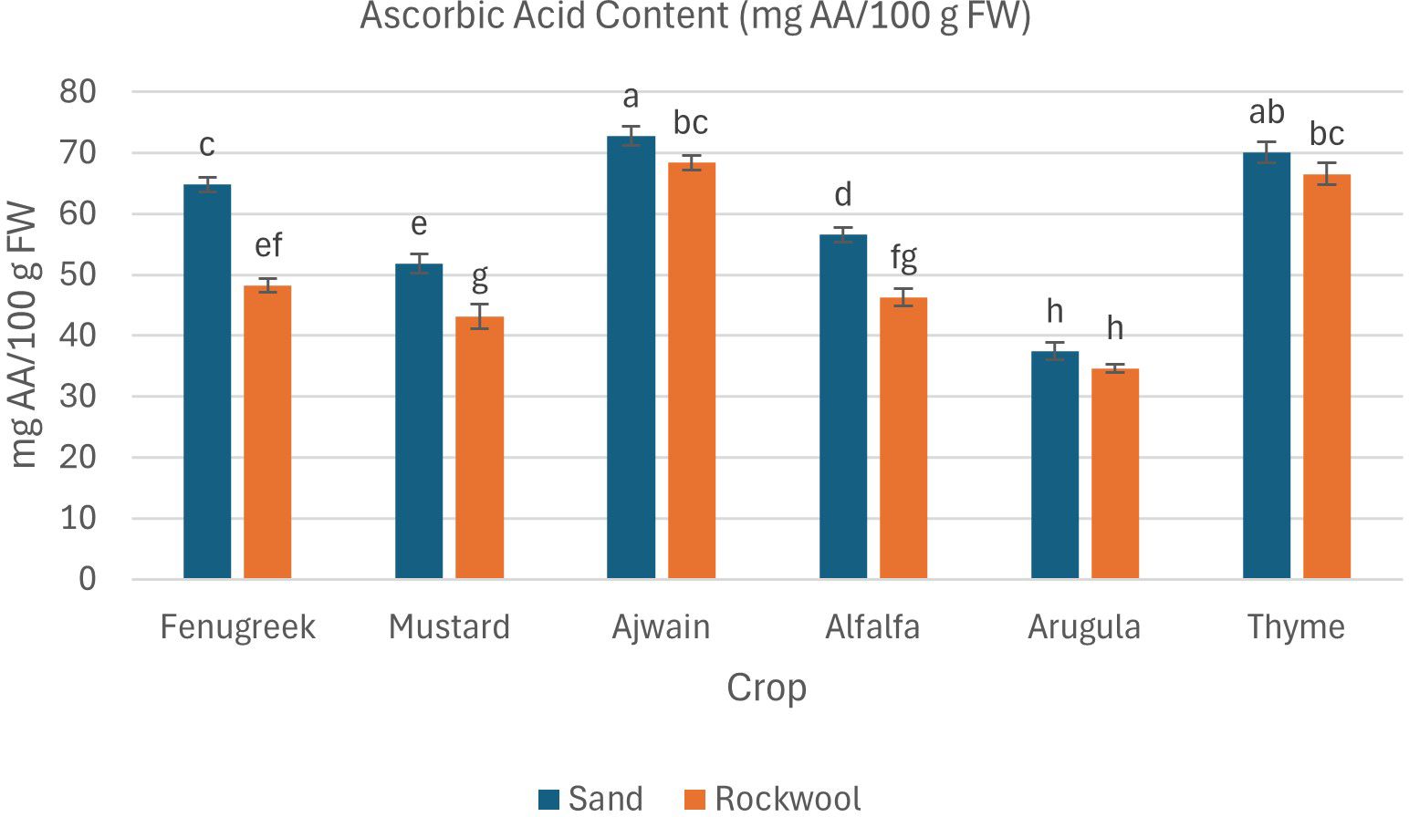 Ascorbic acid accumulation was influenced by both media type and crop species in this study. Microgreens grown in sand generally demonstrated significantly higher levels of ascorbic acid compared to those grown in rockwool (Figure 10). Ajwain, fenugreek, mustard, and alfalfa showed significant differences in ascorbic acid content between sand and rockwool, whereas arugula and thyme did not. Among the six species, ajwain consistently exhibited the highest ascorbic acid content, with 72.73 mg AA/100 g FW in sand. The lowest ascorbic acid content was observed in arugula grown in rockwool (34.63 mg AA/100 g FW).