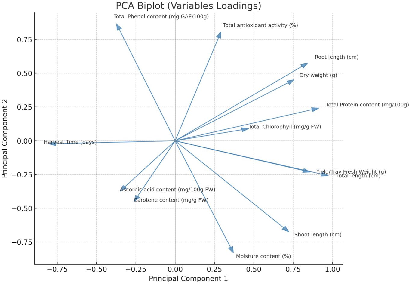 Figure 11. PCA biplot showing variable loadings of growth and biochemical parameters in microgreens.