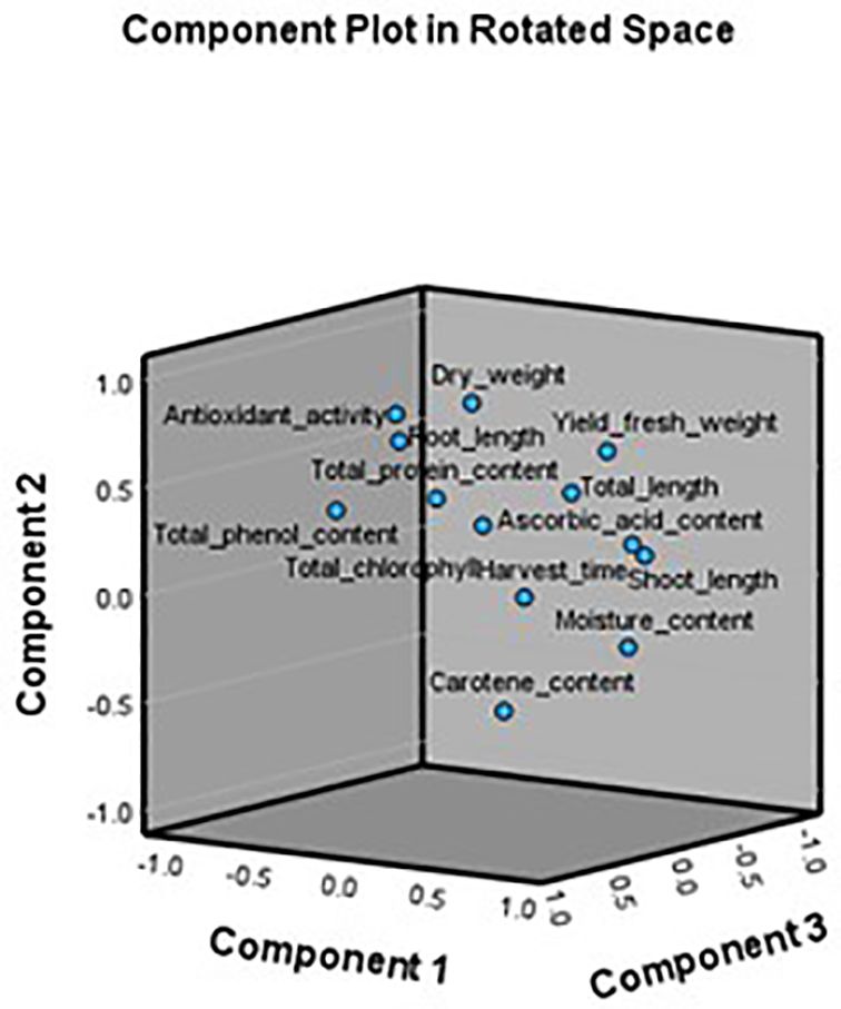 PCA Analysis was conducted to understand the relationships among 13 growth and biochemical parameters of 6 microgreens species grown under 2 different substrates (sand, rockwool). This analysis aimed to reduce data dimensionality and identify underlying latent factors. The Kaiser-Meyer-Olkin (KMO) measure of sampling adequacy was 0.749, which indicates that the sample is suitable for PCA. Bartlett’s Test of Sphericity was statistically significant (p<.001), confirming that correlations among variables were adequate to proceed with PCA. The communalities after extraction ranged from 0.750 (Moisture Content) to 0.989 (Root Length), indicating that the retained components explained a substantial portion of variance for most variables. PCA identified four principal components with eigenvalues greater than 1, cumulatively explaining 88.42% of the total variance. Component 1 accounted for 39.82%, Component 2 for 24.98%, Component 3 for 13.65%, and Component 4 for 9.97%. These components were extracted using the Varimax rotation method to enhance interpretability. The rotated component matrix revealed distinct loading patterns. Component 1 showed strong positive loadings for Shoot Length (0.925), Total Length (0.714), Yield/Tray Fresh Weight (0.690), and Moisture Content (0.840). Component 2 was characterized by high loadings for Dry Weight (0.880), Total Antioxidant Activity (0.753), and Root Length (0.750). Component 3 reflected significant contributions from Total Protein Content (0.739) and Root Length (0.603), while Component 4 included high loadings for Total Chlorophyll (0.848) and Carotenoid Content (0.709). The scree plot confirmed the retention of four components, with a clear inflection point after the fourth component. The PCA biplot (Figure 11) further illustrates the relationships among variables and components, where related variables are clustered together, while Figure 12 gives the component plot in rotated space.