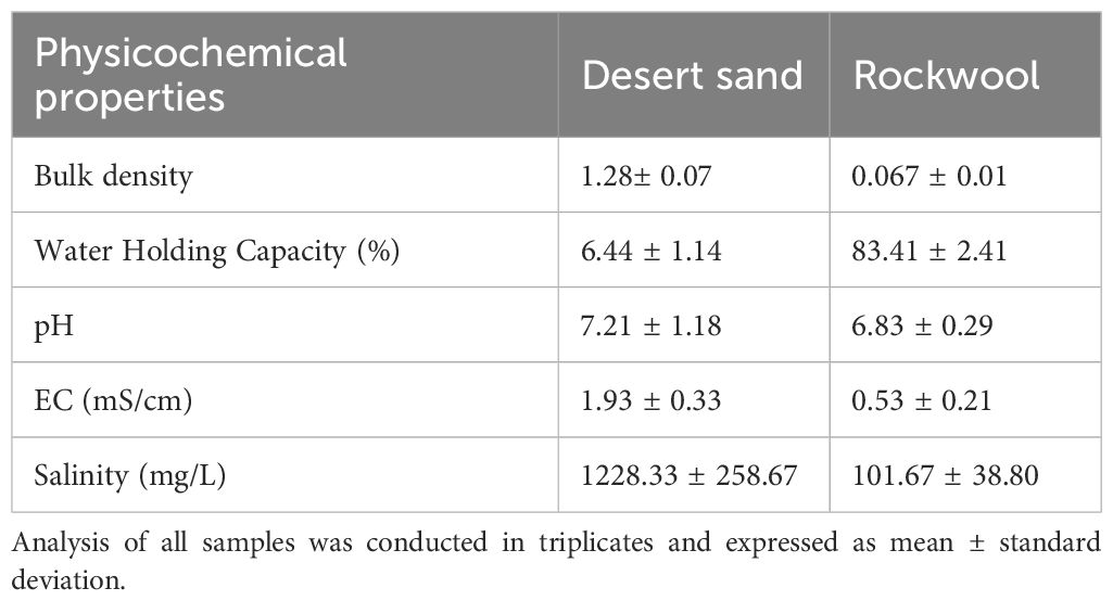 Table 1 summarizes the physiochemical properties of desert sand along with a comparison with rockwool. Desert sand exhibited a bulk density of 1.28 ± 0.07 g/cm³, which was considerably higher than that of rockwool (0.067 ± 0.01 g/cm³), reflecting its denser structure. The water holding capacity of sand was low (6.44 ± 1.14%) compared to rockwool (83.41 ± 2.41%), indicating limited water retention. The pH of sand was slightly alkaline (7.21 ± 1.18), while rockwool was slightly acidic (6.83 ± 0.29). Electrical conductivity (EC) and salinity were higher in sand (1.93 ± 0.33 mS/cm and 1228.33 ± 258.67 mg/L, respectively) than in rockwool (0.53 ± 0.21 mS/cm and 101.67 ± 38.80 mg/L), suggesting greater ionic content in the natural substrate.