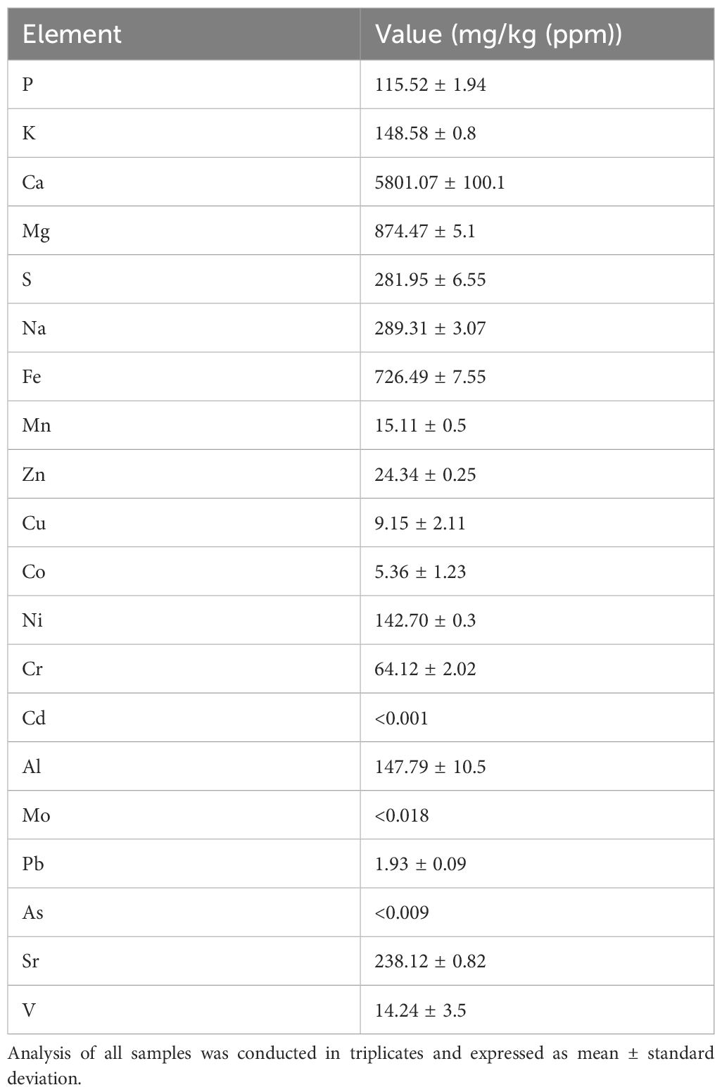 The simultaneous analysis of major minerals and trace elements in plant samples was conducted using Inductively Coupled Plasma Optical Emission Spectroscopy (ICP-OES). Element extraction from the plant samples was achieved using the CEM Mars 5 microwave digestion system, in accordance with USEPA method 3015A (Nishanth et al.,2024). This method mimics traditional extraction with nitric acid (HNO3) and hydrochloric acid (HCl) through heating. For sample preparation, 0.5 gr of each plant sample was accurately weighed and placed into microwave digestion vessels, to which 10 mL of concentrated nitric acid and 2 mL of hydrochloric acid were added. The vessels were then sealed and placed in the microwave digestion system. ICP Expert software was employed to set up an appropriate program, selecting the analyte elements along with their wavelengths, sensitivities, interferences, and linear regression equations. Mixed calibration standard solutions (Merck) were used to create calibration curves for each element, and calibration check standard solutions (Romil) were also aspirated and their values recorded. Finally, the prepared sample solutions were aspirated, and element concentrations (P, K, Ca, Mg, S, Na, Fe, Mn and Zn) were determined using the calibration curves.