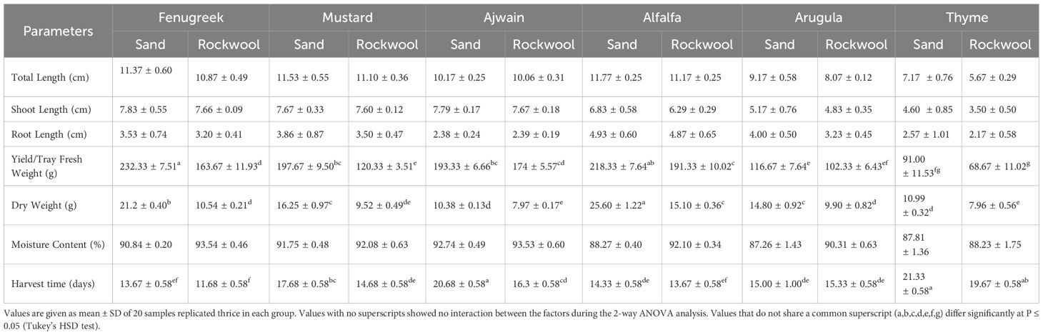 Table 3. Growth parameters of the different microgreen species when grown in sand and rockwool media.