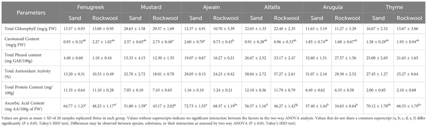 The result of phytochemical analysis of different microgreens grown in sand and rockwool media are given in Table 4. Phytochemical analysis revealed varied responses of microgreens to different growth media. Across various parameters, sand media consistently demonstrated comparable or slightly higher phytochemical contents compared to rockwool media for all six microgreens: fenugreek, mustard, ajwain, alfalfa, arugula, and thyme.