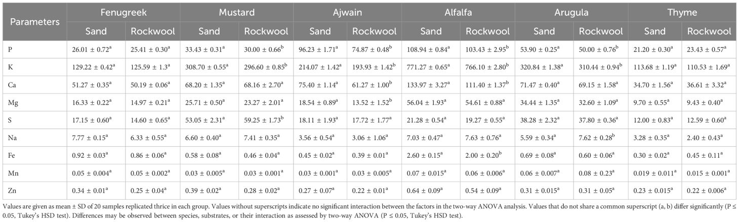 Microgreens grown in sand medium recorded a higher amount for most of the elements. The amount of phosphorus (P) was highest for alfalfa plants across both substrates and was followed by ajwain plants. Among all macro elements, the amount of potassium (K) exhibited the greatest variation, ranging from a minimum of 110.53 mg per 100 g fresh weight (FW) in thyme grown in rockwool to a maximum of 771.27 mg per 100 g FW in alfalfa grown in sand. The calcium (Ca) content was highest for sand-grown alfalfa plants. A similar trend was also observed in the case of magnesium, wherein alfalfa plants grown in sand recorded the highest concentration (56.04 mg/100g FW). Sodium (Na) amount for sand-grown plants was higher for fenugreek (7.77 mg/100g FW), ajwain (3.56 mg/100g FW) and thyme (3.28 mg/100g FW). The amount of sulphur was highest in mustard and arugula plants belonging to the Brassicaceae family. It was noteworthy to observe that the sand-grown microgreens had a higher concentration of sulphur (S). Also, in both mustard and arugula, the concentration of sodium was higher for the plants grown in rockwool. The micronutrients, Iron (Fe), manganese (Mn) and zinc (Zn) showed only slight variations. The amount of zinc was highest for sand-grown alfalfa plants (0.64 mg/100g FW), while the amount of manganese was highest for rockwool-grown arugula (0.08 mg/100g FW). Iron concentration was highest for alfalfa plants irrespective of the growth medium.