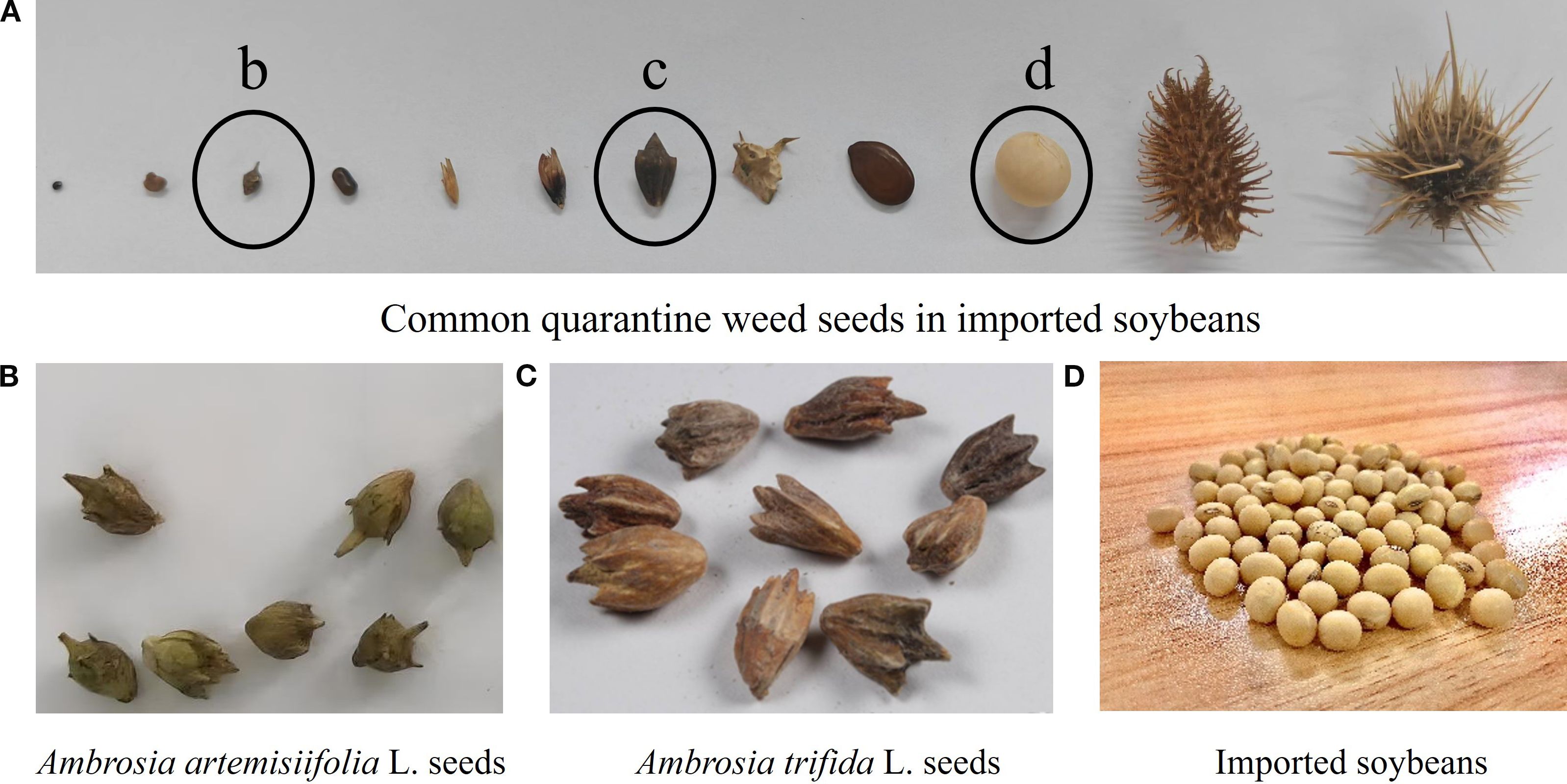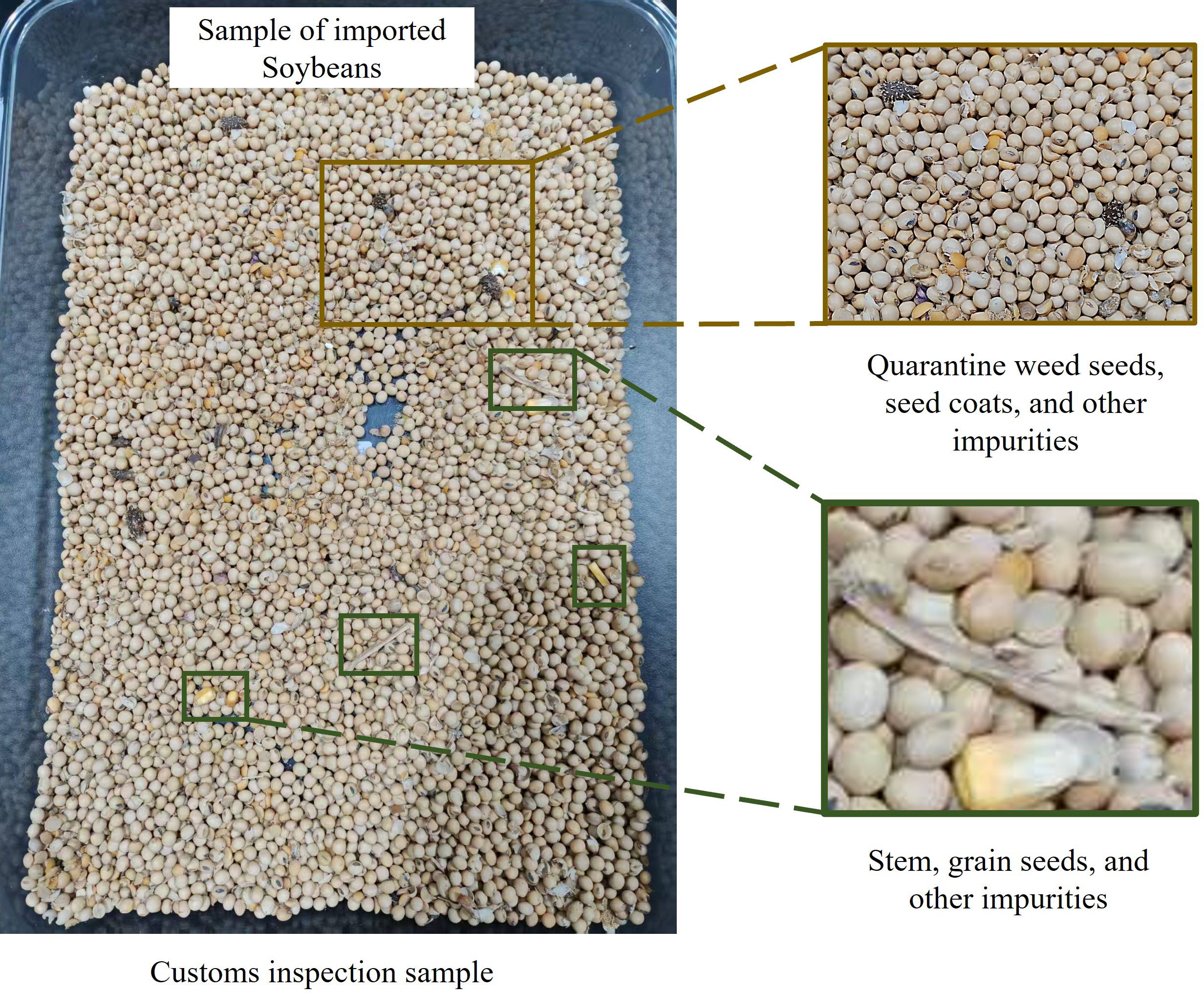 Soybean is a highly nutritious crop widely used in various consumer products and traded globally in large volumes (de Lima et al., 2018). Due to their high volume and broad distribution, soybean shipments are particularly vulnerable to contamination by quarantine weed seeds. The spread of these seeds leads to serious economic (including direct damages and the costs of mitigation and prevention), health (e.g., globally emerging zoonotic diseases), and environmental (e.g., decline in native biodiversity) issues (Jay et al., 2003; Hall, 2011; Baider and Florens, 2011). According to the InvaCost Database, the global mean annual cost associated with invasive alien species may reach USD 162.7 billion (Diagne et al., 2021). Additionally, variation in quarantine standards across countries results in differing criteria for determining sample acceptability (Davies and Sheley, 2007), posing major challenges to the effective implementation of quarantine procedures. These issues highlight the need for effective measures to detect, control, and manage the spread of these harmful organisms (Meyerson and Reaser, 2002; Magarey et al., 2009). Consequently, the development of a rapid and accurate method for detecting quarantine weed seeds is critically important.