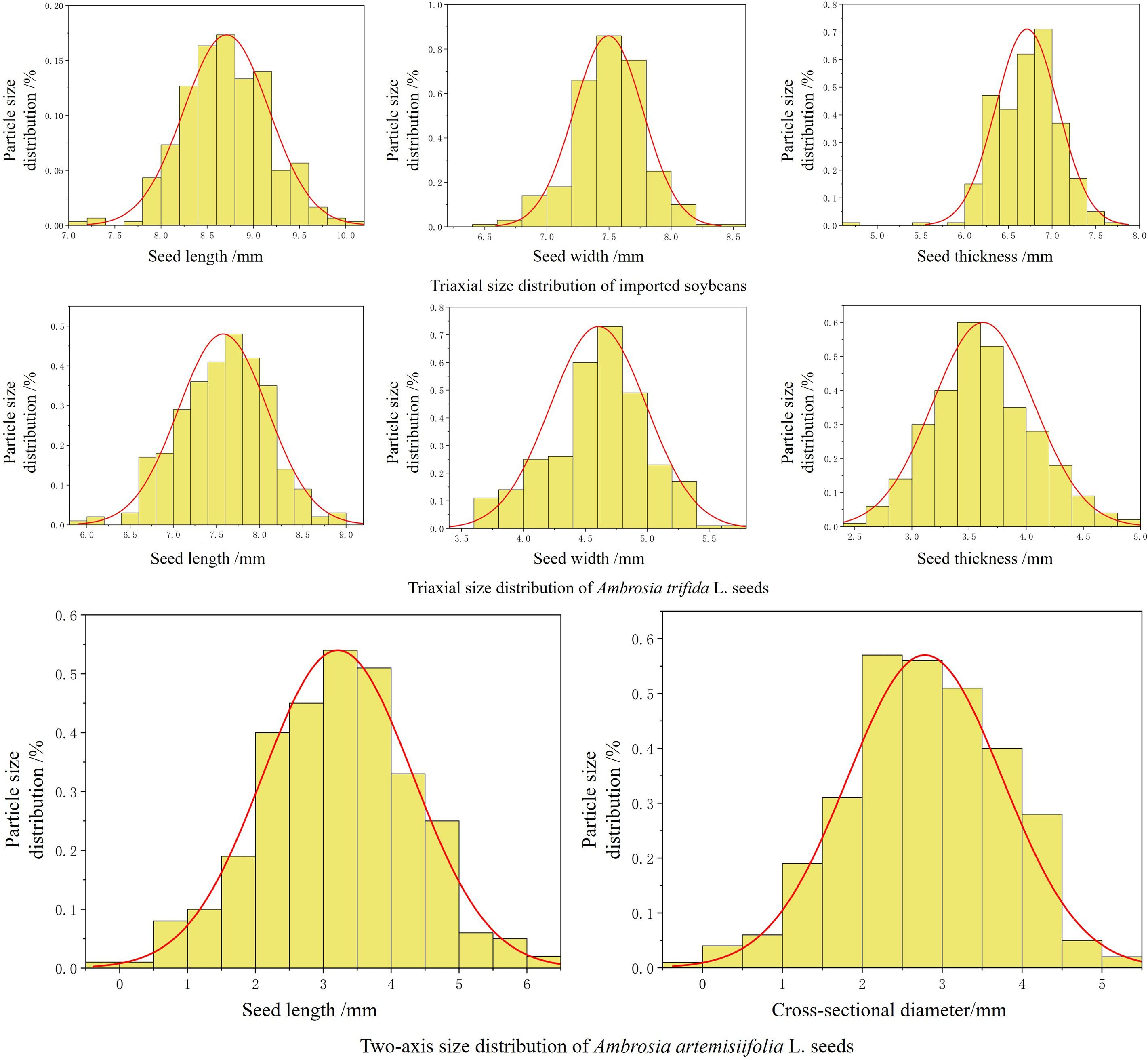The dimensions of imported soybeans and two types of quarantine weed seeds were measured. For each seed type, 500 ± 10 samples were randomly selected and measured using a digital vernier caliper with an accuracy of 0.01 mm (DELIXI Electric, Hangzhou, China). The dimensional and particle size distributions are shown in Figure 3. The average values were used as design references. The imported soybeans had an average length of 7.65 mm, a width of 6.52 mm, and a thickness of 5.70 mm. A. trifida seeds had an average length of 7.57 mm, a width of 4.57 mm, and a thickness of 3.69 mm. Due to the smaller size of A. artemisiifolia seeds and the minimal difference between their width and thickness, only the length and cross-sectional diameter were measured, with average values of 3.22 mm and 2.84 mm, respectively.