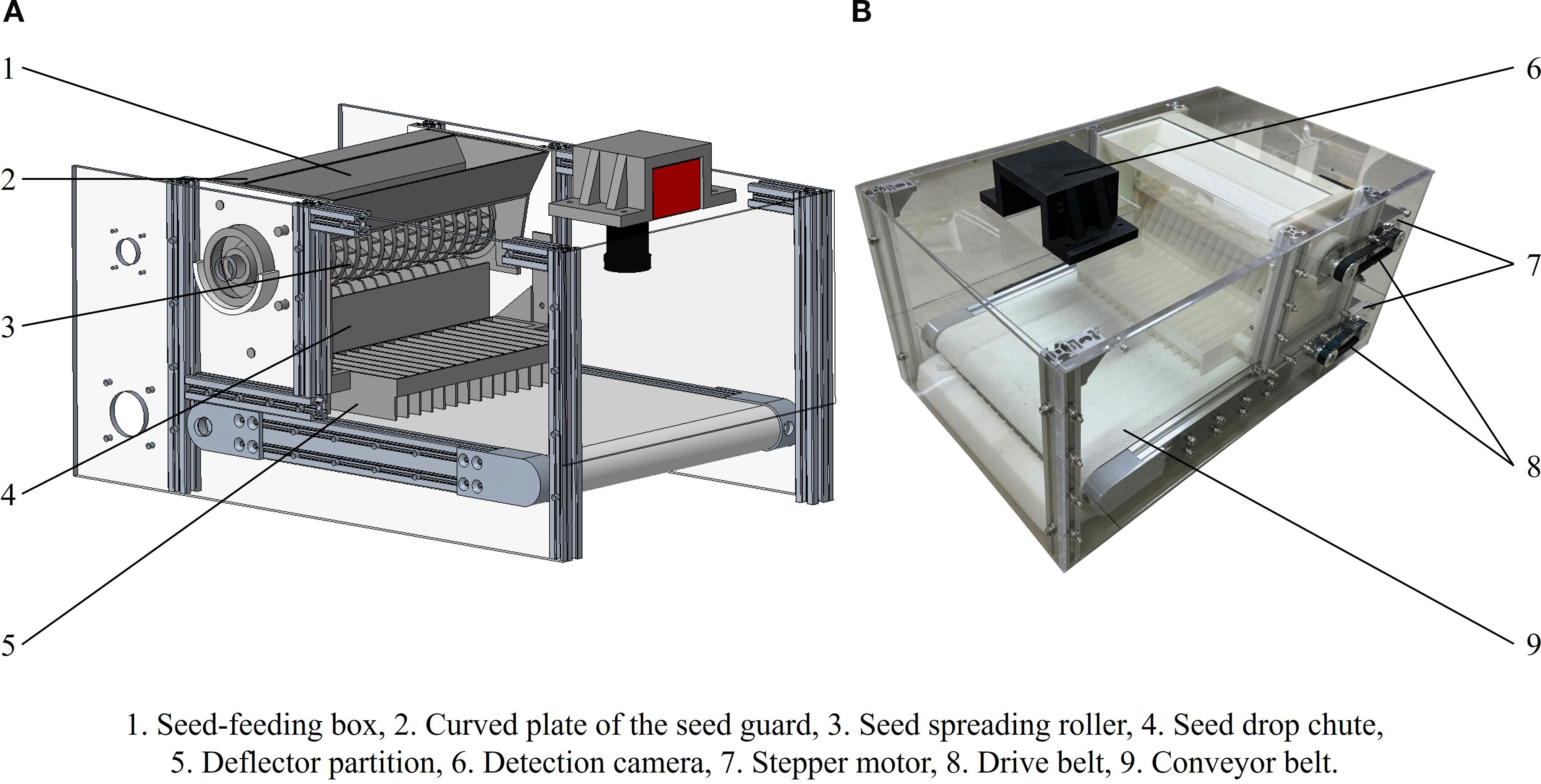 The detection device measures 262 cm in height, 544 cm in length, and 334 cm in width. The single-seed uniform distribution and spreading mechanism consists of a seed dispenser and a conveyor belt, as illustrated in Figure 4.