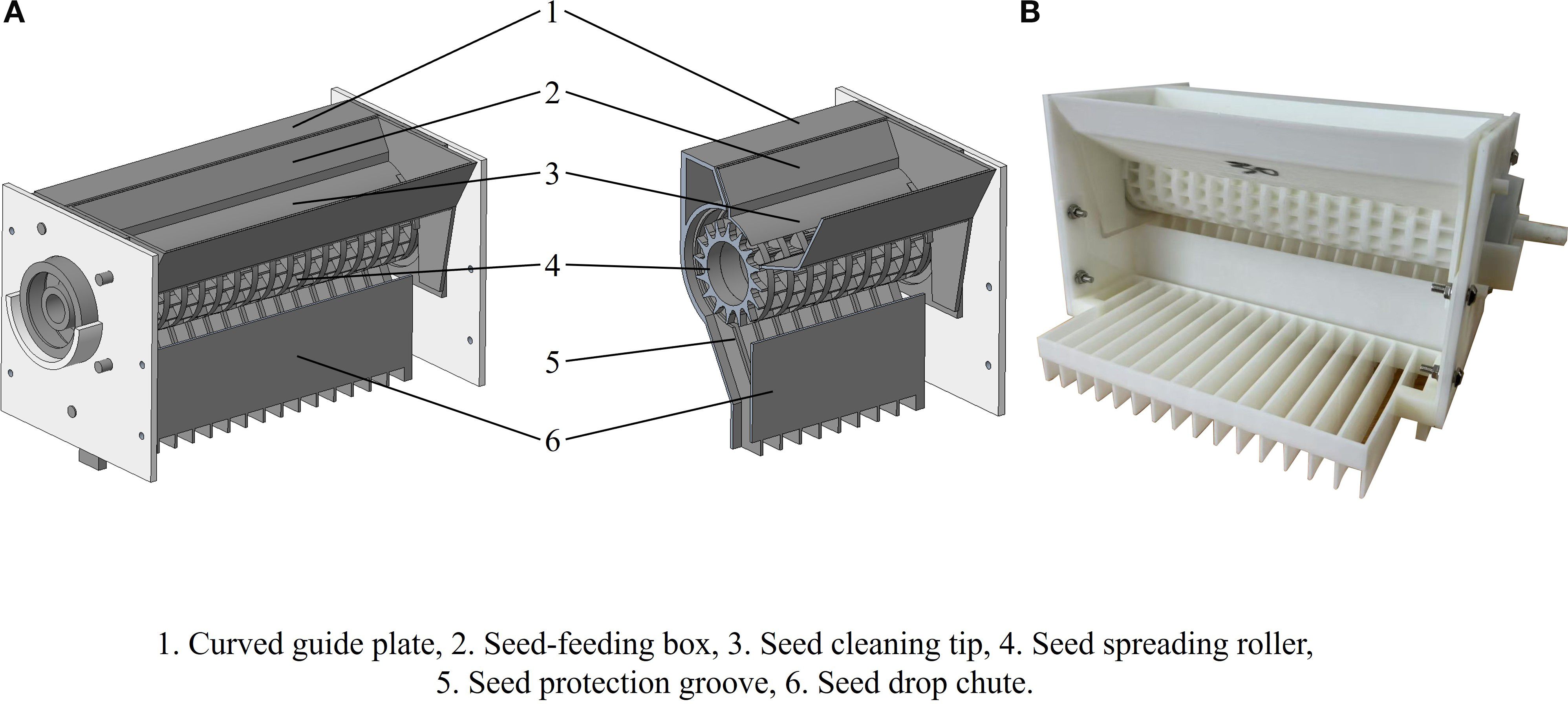 Figure 4. Schematic (A) and photograph (B) of single-seed uniform distribution and spreading device.