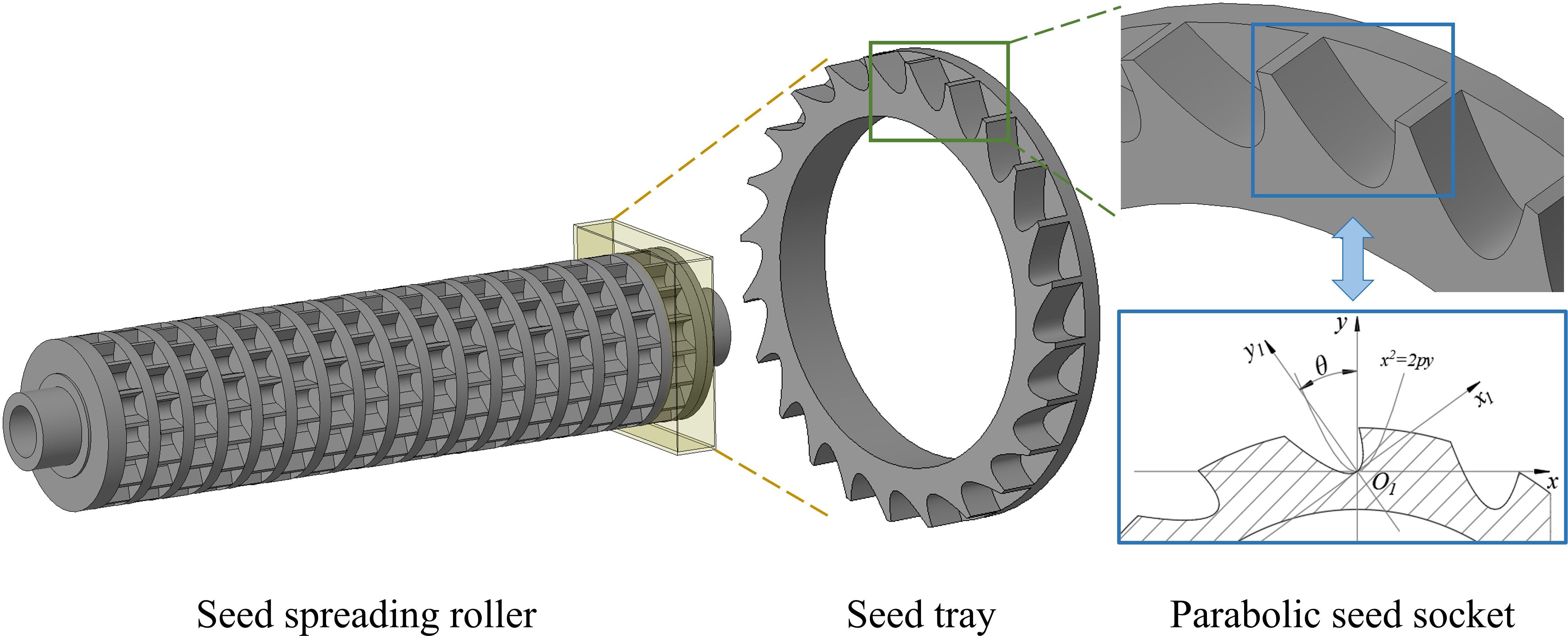 The seed spreading roller plays a pivotal role in determining the performance of the seed dispenser. Key design parameters of the roller include its diameter, the number of seed sockets, and the socket geometry. Considering the typical diameters used in existing soybean dispensers and the spatial constraints of the overall system, a diameter of 120 mm was selected. Uniform seed distribution depends heavily on the compatibility between the socket shape and the physical characteristics of imported soybeans and quarantine weed seeds. The three seed types, which are imported soybeans, A. artemisiifolia, and A. trifida, differ significantly in both shape and size. Their proportions are typically unbalanced, with soybeans accounting for the majority of the mixture. To address this issue, a parabolic seed socket was designed based on the equation x² = 2py. This shape has a zero slope at the vertex, which allows seeds to naturally decelerate and stabilize within the cavity. The narrowing profile toward the bottom accommodates seeds of different sizes. In addition, the sockets are inclined at a specific angle to improve the efficiency of seed filling, transportation, and discharge. This design reduces filling time and ensures more stable seed retention. The final specifications of the socket include a length of 14 mm, a width of 10 mm, a focal length p = 2.98 mm, and a rotation angle θ = 32.46°, with 24 sockets arranged on each tray. A schematic diagram of the roller and socket is shown in Figure 6.