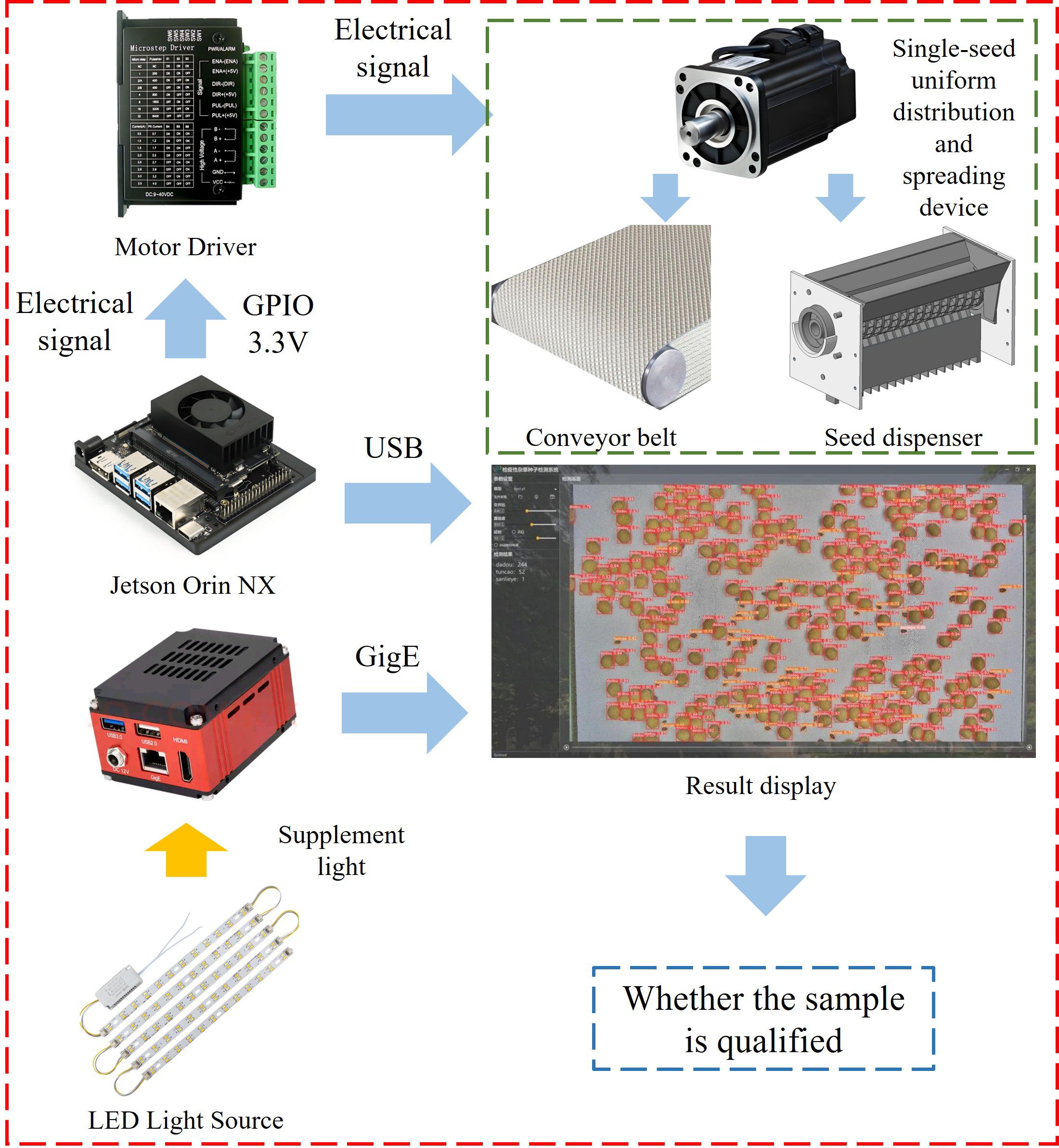 Currently, the identification of quarantine weed seeds largely relies on manual techniques such as protein electrophoresis, DNA barcoding, and gas chromatography (Huang et al., 2015; Lei et al., 2017; Whitehurst et al., 2020). However, these methods are often costly and time-consuming, making them unsuitable for large-scale applications (Rahman and Cho, 2016; ElMasry et al., 2019). With advances in electronics and microprocessor technology, the development of detection devices has offered new approaches for the identification of quarantine weed seeds (Thakuria and Erkinbaev, 2024; Zhao et al., 2025). Several devices and systems have been developed for seed sorting and quality assessment. Zhao et al. (2021) developed a real-time detection system for comprehensive surface inspection of soybeans, in which pneumatic actuators rotated the samples for multi-angle imaging. An enhanced MobileNetV2 model was applied, achieving an accuracy of 98.87%. Similarly, Wang et al. (2023) proposed an online cottonseed classification device using a rotary disc and fixed partitions for single-seed positioning. Dual cameras captured images of falling seeds, and a YOLOv5-based model classified them as intact, damaged, or moldy, achieving an accuracy of 99.6%. Despite their reliable detection capabilities, the high construction and maintenance costs have limited their practical application in agriculture. Furthermore, since these devices are generally designed for specific seed types, their effectiveness is reduced in quarantine inspections where seed diversity is high. Most existing devices perform detection after singulation. While manageable for small quantities, high-throughput quarantine inspections make efficient singulation difficult. These challenges underscore the importance of developing a real-time, high-throughput detection system that is cost-effective and adaptable to a variety of seed types.