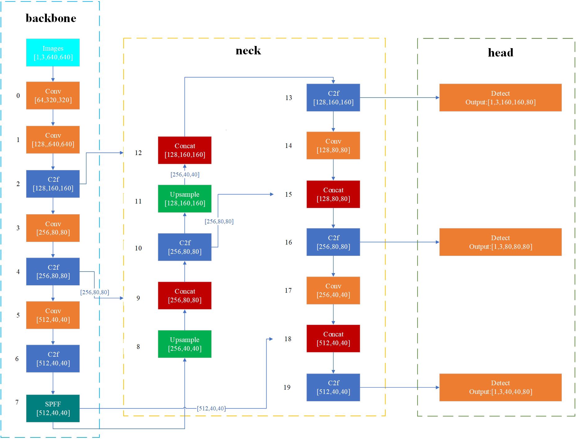 To address this issue and improve detection accuracy for A. artemisiifolia, targeted modifications were applied to the YOLOv8n model. A P2 detection head was added to enhance the model’s ability to detect small objects. Because the inclusion of the P2 head increases model complexity, and all target objects in this application are relatively small with no large-scale instances, the P5 detection head was removed. The architecture of the improved YOLO_P2 model is illustrated in Figure 9.