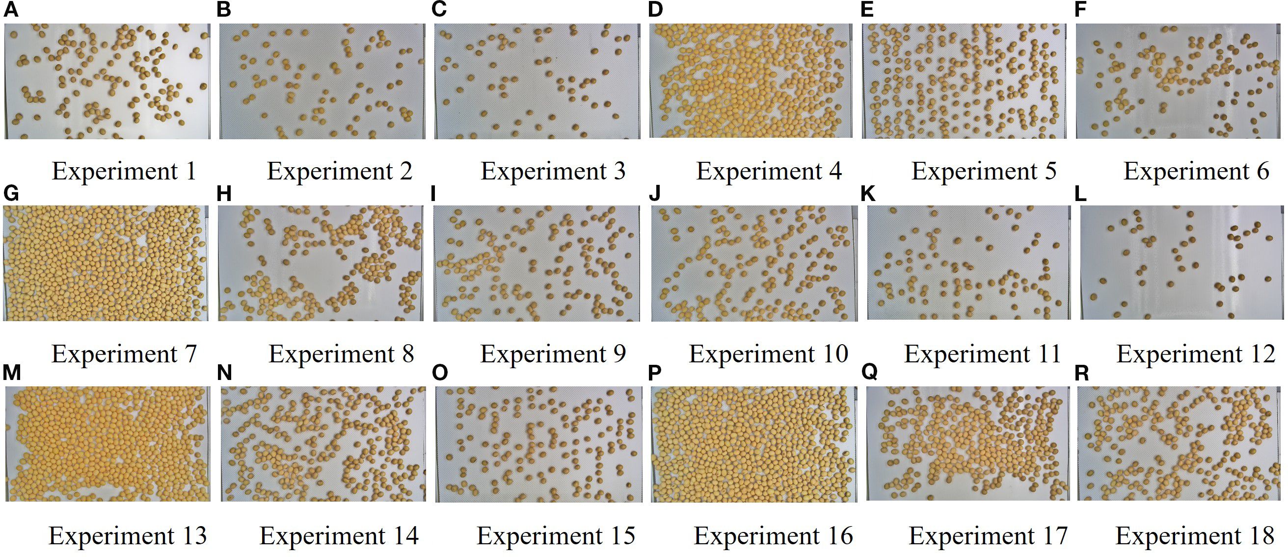 A total of 5,567 images were collected throughout the experiment, with representative examples shown in Figure 10. These images reveal distinct variations in seed spreading performance across different experimental groups. Using images of imported soybeans as a reference, the seed distribution patterns ranged from sparse to dense and from disordered to well organized. This suggests that the parameter combinations of the device components had a significant influence on the uniformity and effectiveness of seed distribution.