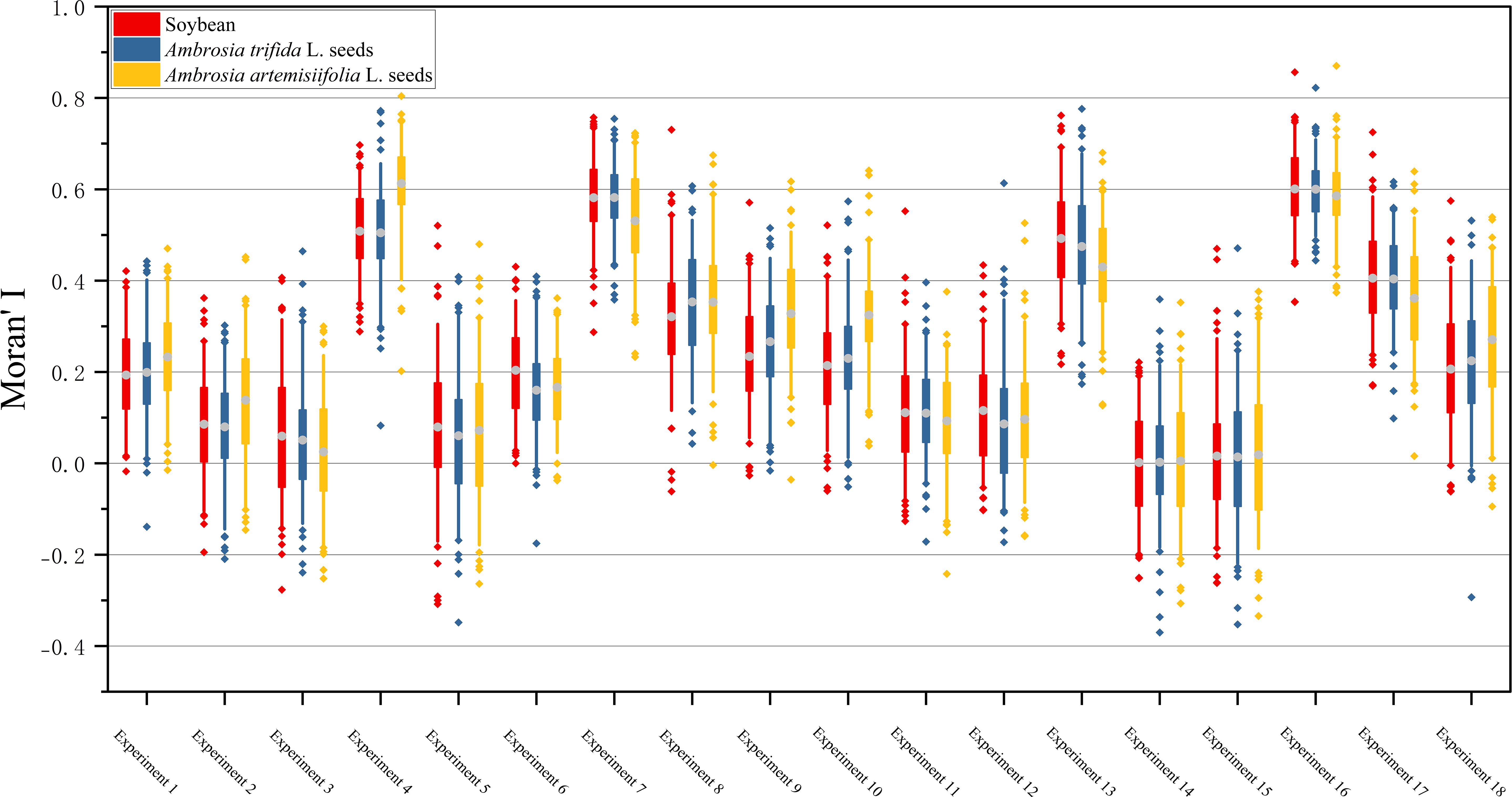 The mean Moran’s I coefficients across all groups were greater than zero, indicating an overall tendency toward clustered seed distribution. This result was consistent with the experimental design objective, which aimed to reduce seed adhesion and occlusion while maintaining a dense seed arrangement.