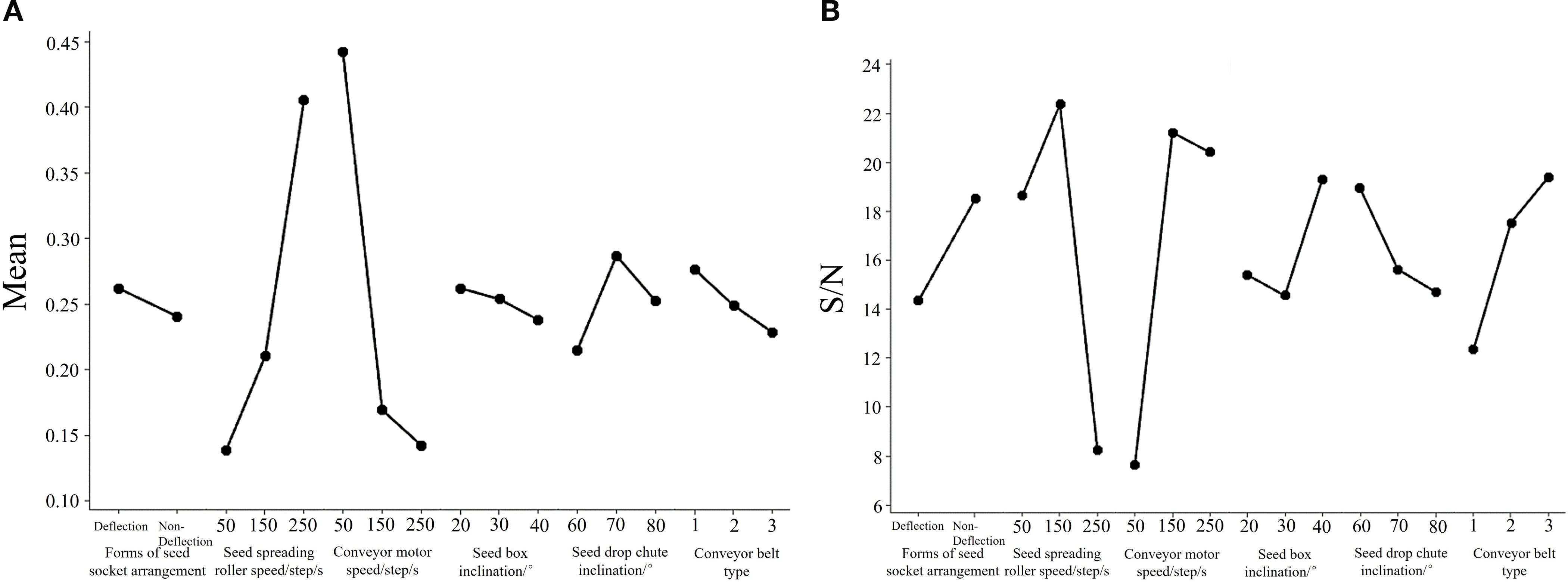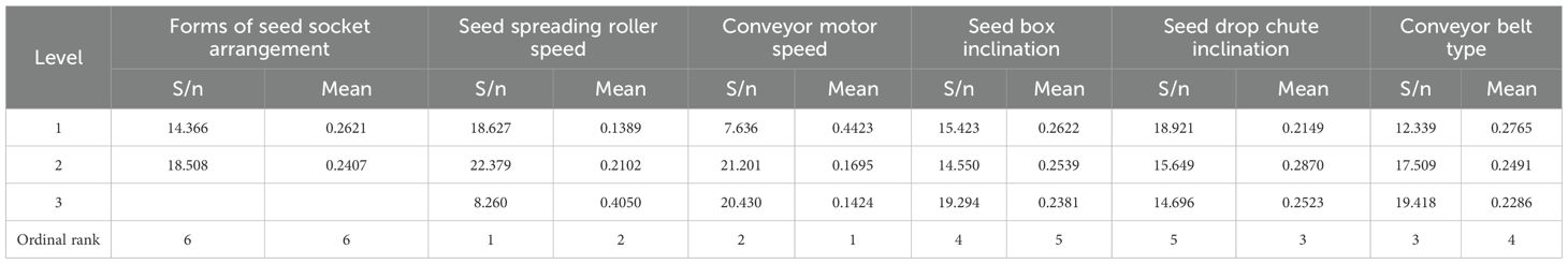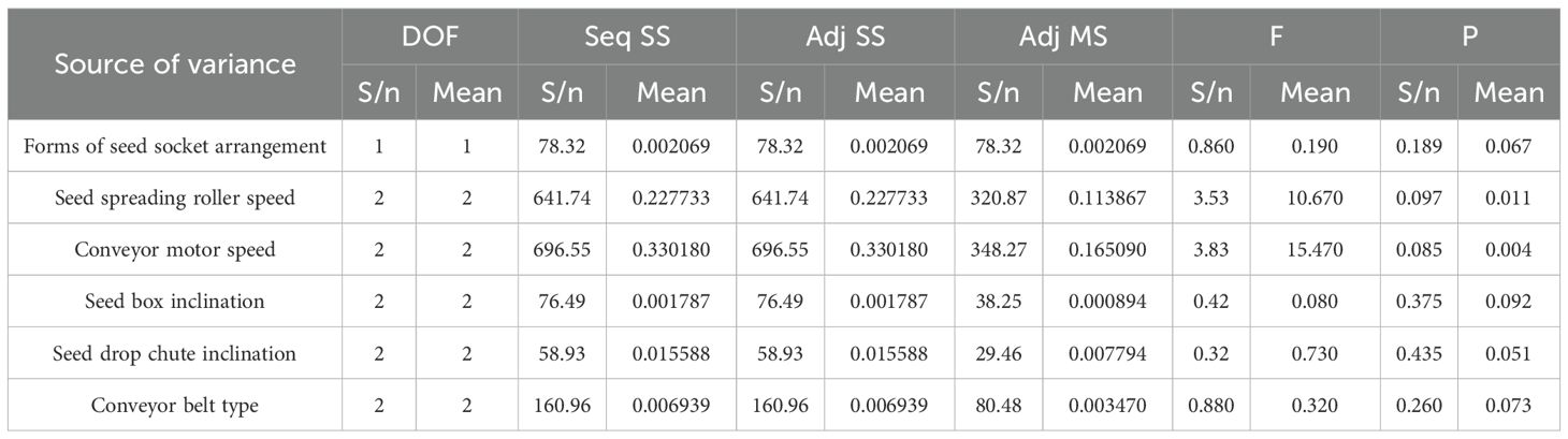 By comparing the rankings of the S/N ratios and the mean values, it is evident that seed spreading roller speed and conveyor motor speed are the most influential factors, as they consistently occupy the top two positions in both analyses. Therefore, when selecting the optimal levels for these two factors, it is important to consider both mean performance and stability, as reflected by the S/N ratio. The arrangement of seed sockets had the least impact, ranking sixth in both evaluations.