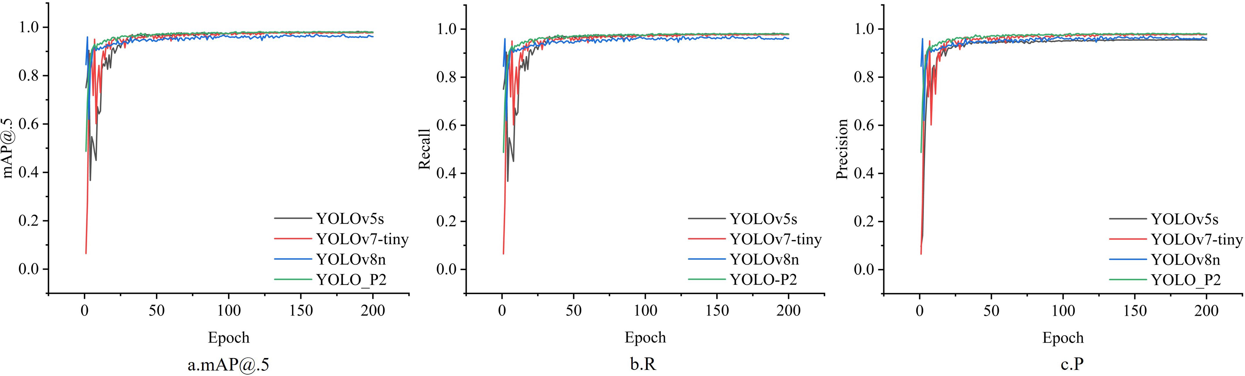 The training outcomes are summarized in Table 5, and the trends in mAP and Recall for each model are illustrated in Figure 13. As shown in Figure 13, the mAP, Precision, Recall, and corresponding curves for the YOLOv5s and YOLOv7-tiny models exhibit substantial fluctuations, indicating unstable detection performance. In contrast, the modified YOLO_P2 model demonstrates reduced fluctuations and improved stability.