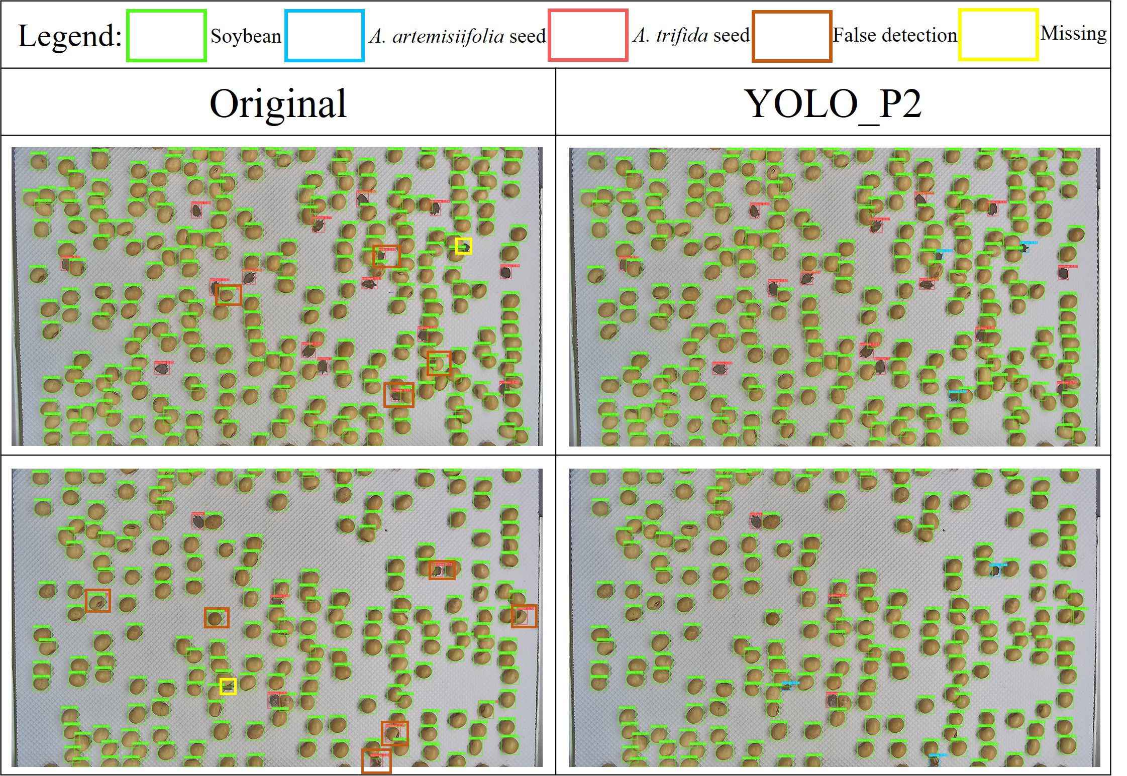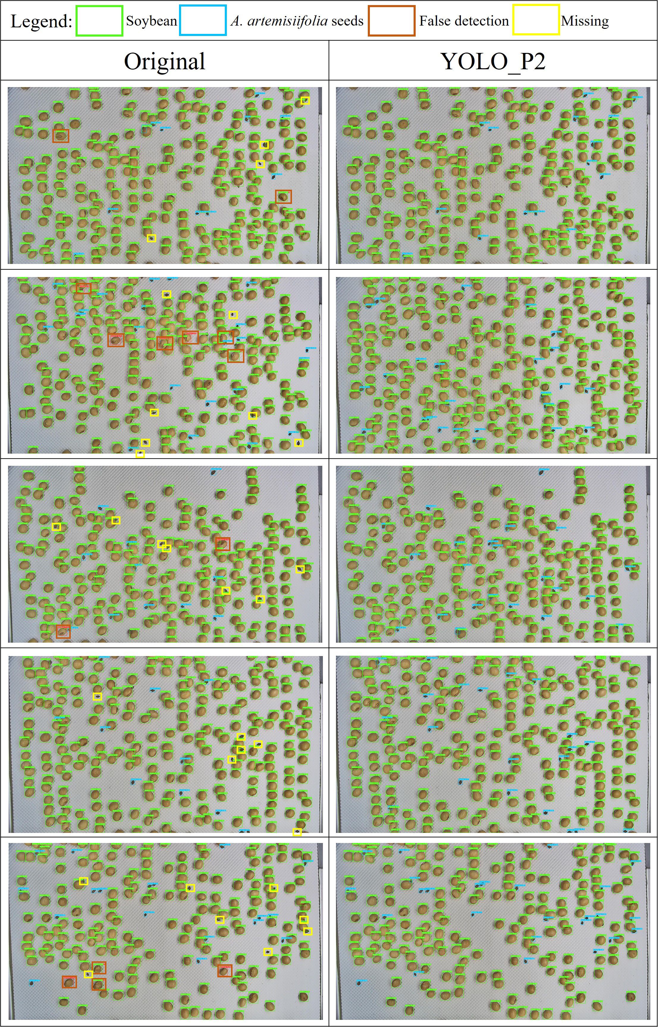 Figure 15 presents a comparison between the original model and the YOLO_P2 model in detecting mixed samples containing imported soybeans, A. trifida, and A. artemisiifolia. seeds. The original model exhibited both false detections and missed detections during the recognition process, particularly showing poor performance when the A. artemisiifolia seeds were partially occluded. In contrast, the YOLO_P2 model demonstrated superior performance in handling occlusion and accurately identifying A. artemisiifolia seeds, resulting in a notable improvement in overall detection accuracy.