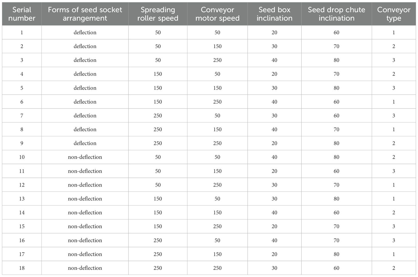 The experimental factors and levels were determined based on preliminary single-factor tests and analysis of variance (ANOVA), ensuring that the selected parameter ranges adequately represented the main factors influencing system performance. To assess the effects of different parameter levels on seed distribution uniformity and detection performance under high-throughput conditions, the following factors were included: seed socket arrangement, seed spreading roller speed, conveyor motor speed, seed box inclination, seed drop chute inclination, and conveyor belt type. The levels were defined as follows. The seed socket arrangement was classified as either deflected or non-deflected. The spreading roller speed was set to 50, 150, and 250 steps per second, and the conveyor motor speed was also set to 50, 150, and 250 steps per second. The seed box inclination angles were 20°, 30°, and 40°, while the chute inclination angles were 60°, 70°, and 80°. Three conveyor belt types were tested: a smooth white surface, a white diamond-patterned belt, and an enhanced diamond-patterned belt with a deflector partition at the end of the chute.