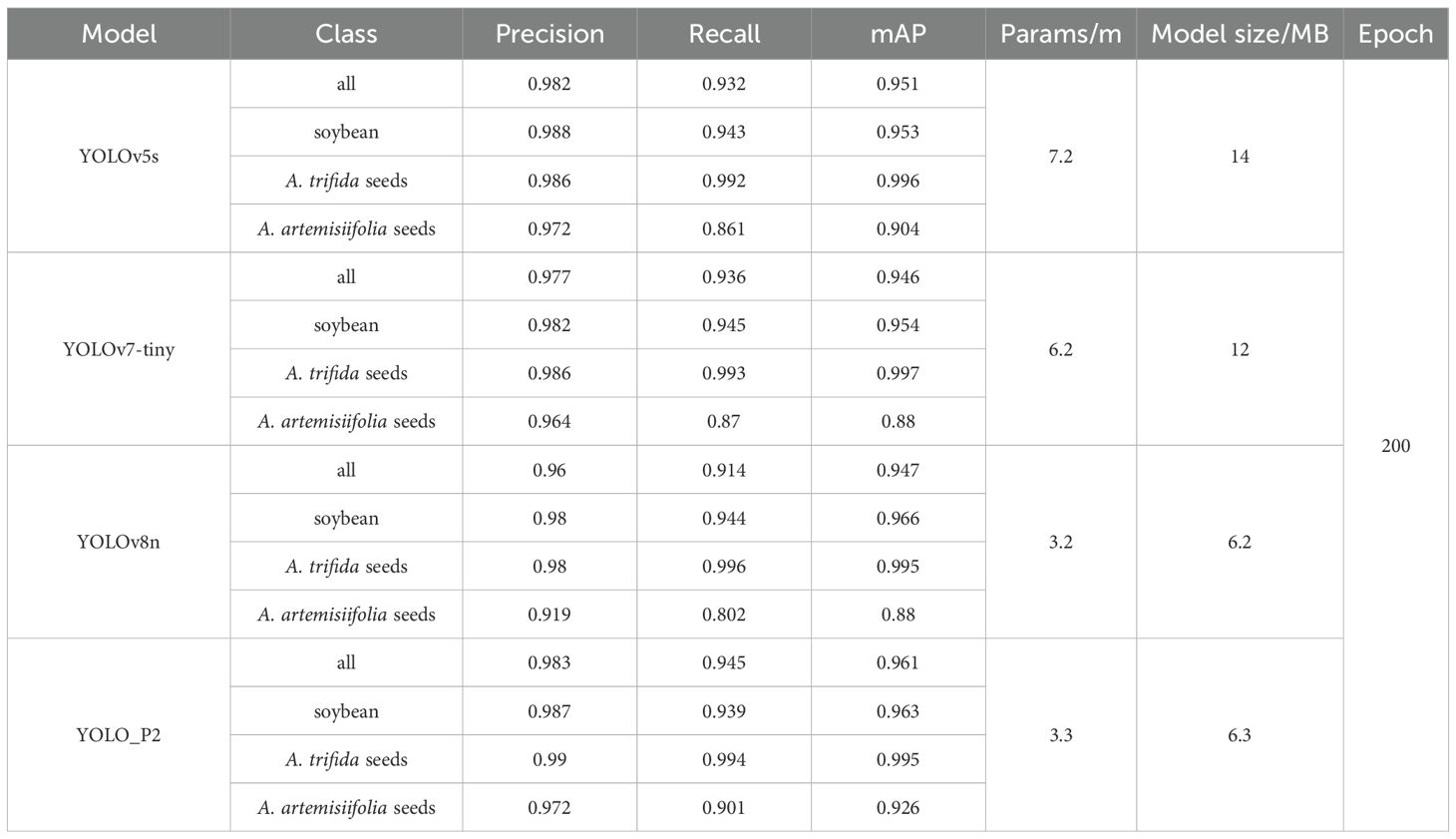 The average mAP across all three models was approximately 95%. The YOLOv5s model achieved the highest detection accuracy for A. artemisiifolia seeds at 90.4%, which was 2.4 percentage points higher than those achieved by the other two models. For imported soybeans, YOLOv8n attained the best detection accuracy at 96.6%, outperforming YOLOv5s and YOLOv7-tiny by 1.3 and 1.2 percentage points, respectively. Notably, YOLO_P2, built upon YOLOv8n, significantly enhanced the detection of small targets (such as A. artemisiifolia seeds) without increasing model parameters or model size, thereby achieving superior performance while maintaining efficiency.