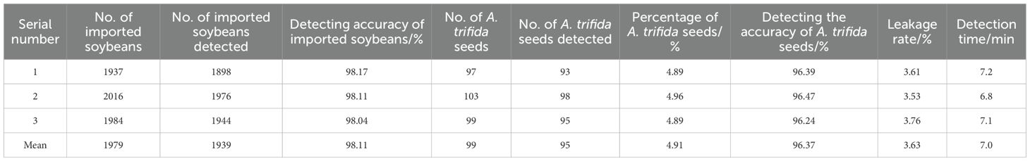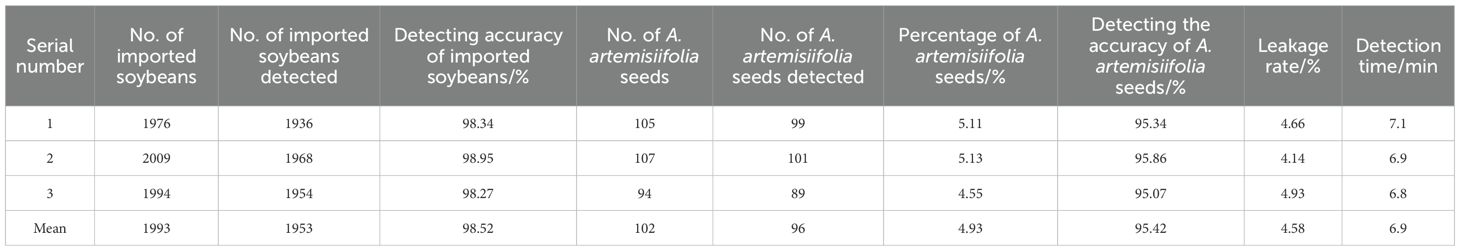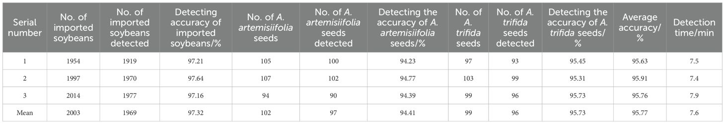 Verification experiments confirmed that the average detection accuracy reached 95.77%, with an average detection time of 7.6 minutes. The proposed detection system is suitable not only for the quarantine inspection of imported soybeans, but also for the identification of other seed types. Beyond its demonstrated performance on A. artemisiifolia and A. trifida seeds, the proposed model also exhibits strong transferability. With minimal additional data annotation and model fine-tuning, it can be extended to other small-sized seeds with similar particle size or morphology while maintaining the same hardware platform. This highlights the system’s reusability and scalability, and suggests promising potential for broader applications in quarantine inspection scenarios. This work offers an effective method for the rapid acquisition of high-quality, high-throughput seed images and may serve as a valuable tool for laboratory research and other applications requiring efficient generation of annotated datasets.