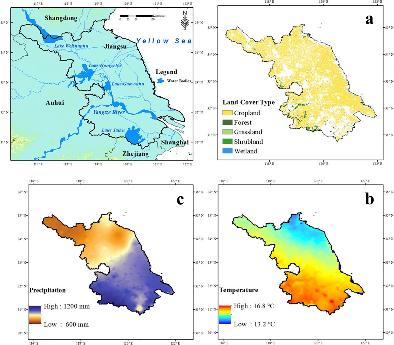 Figure 1. Geographic information of Jiangsu Province. (a) Spatial distribution of land use patterns. (b) Multi-year annual mean temperature. (c) Multi-year annual total precipitation.