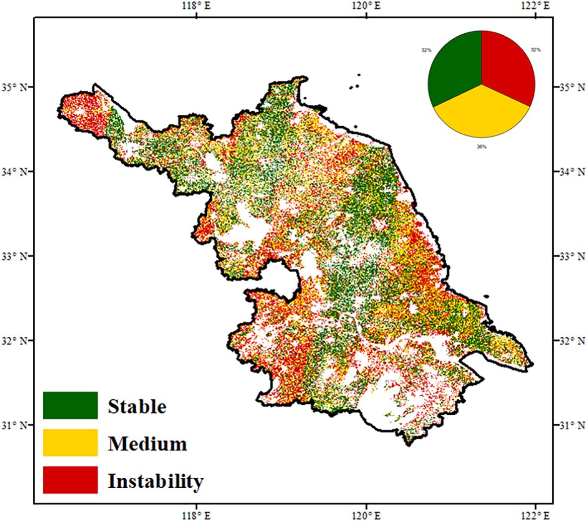 Figure 3. Spatial distribution of stability level in Jiangsu defined by the spatial percentage of mean AR and PV.