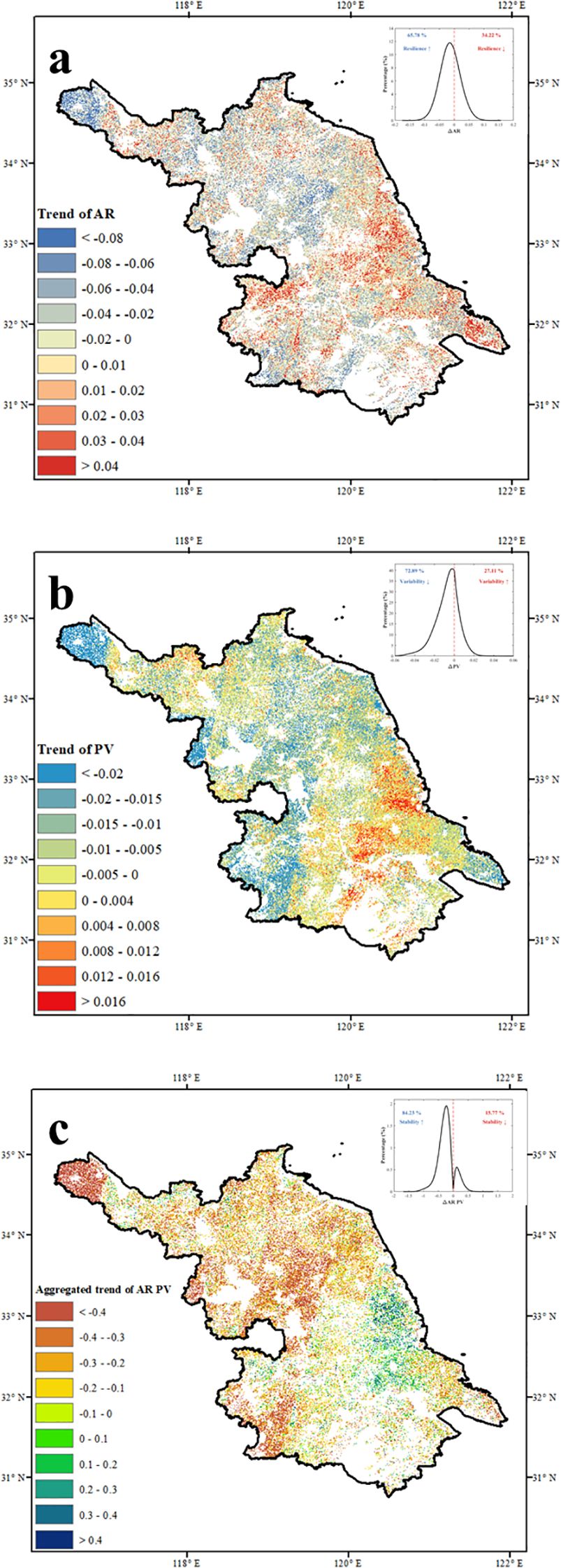 Figure 4. Hot-spots of instability in Jiangsu indicated by the consistent increase or decrease in both ΔAR and ΔPV. spatial distribution of (a) ΔAR, (b) ΔPV, and (c) aggregated ΔAR PV.