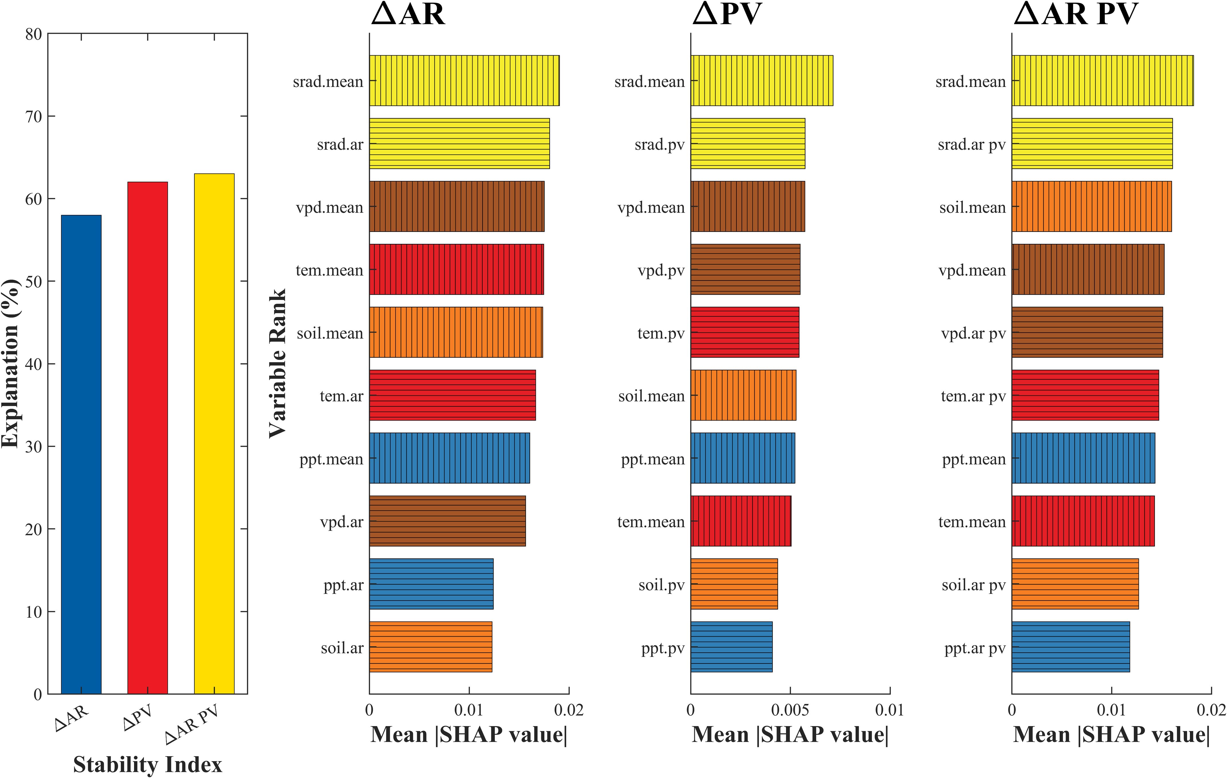 Figure 5. Contribution of climatic stability and background to ΔAR, ΔPV and aggregated ΔAR PV. The left one subfigure is the explanation of validation for three stability indices based on XGBoost models. The right three subfigures are predictors of stability indices and corresponding variable importance based on SHAP value. The two categories of climatic predictors are identified with different hatched fill patterns; whereas the colors distinguish the different variables.