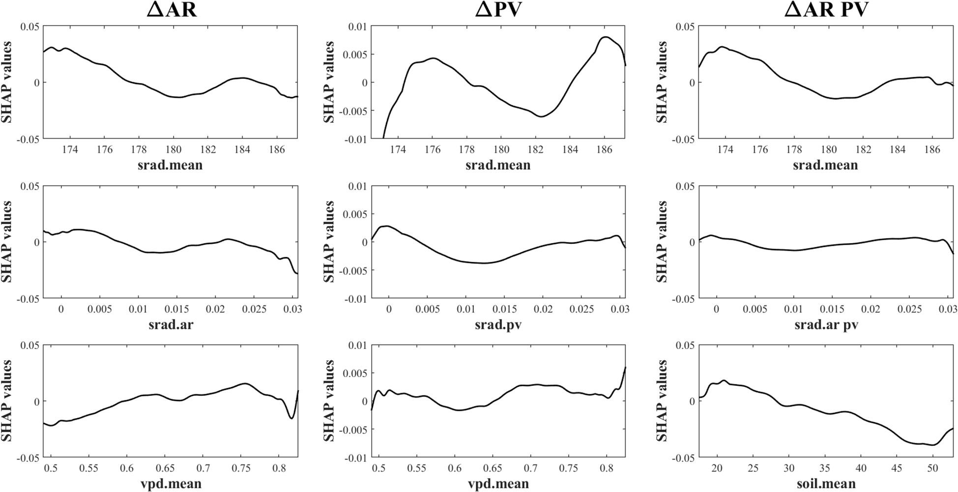 Relationships between the top three predictors and vegetation stability metrics are shown in Figure 6. SHAP dependence plots illustrate both the direction and magnitude of predictor effects. Several variables exhibited nonlinear or threshold-like responses. For instance, SHAP values for AR declined with increasing background radiation, indicating enhanced resilience under higher radiation levels. For PV and ΔAR PV, radiation effects were non-monotonic—initially increasing, then decreasing, and rising again—suggesting that moderate radiation levels optimize stability. VPD showed a consistent destabilizing effect, with SHAP values increasing alongside VPD intensity. In contrast, SHAP values for ΔAR PV declined with increasing soil moisture, highlighting the stabilizing role of moisture availability. Radiative stability (AR, PV or AR PV in the corresponding stability indices) exhibited uniformly negative SHAP values across all metrics, underscoring its consistent stabilizing influence on vegetation productivity. Specifically, Radiative Stability (srad.ar) represents the persistence of solar radiation influencing ecosystem resilience, Radiative Stability (srad.pv) reflects radiation variability shaping short-term fluctuations, and Radiative Stability (srad.ar pv) integrates both components to describe overall ecosystem stability.