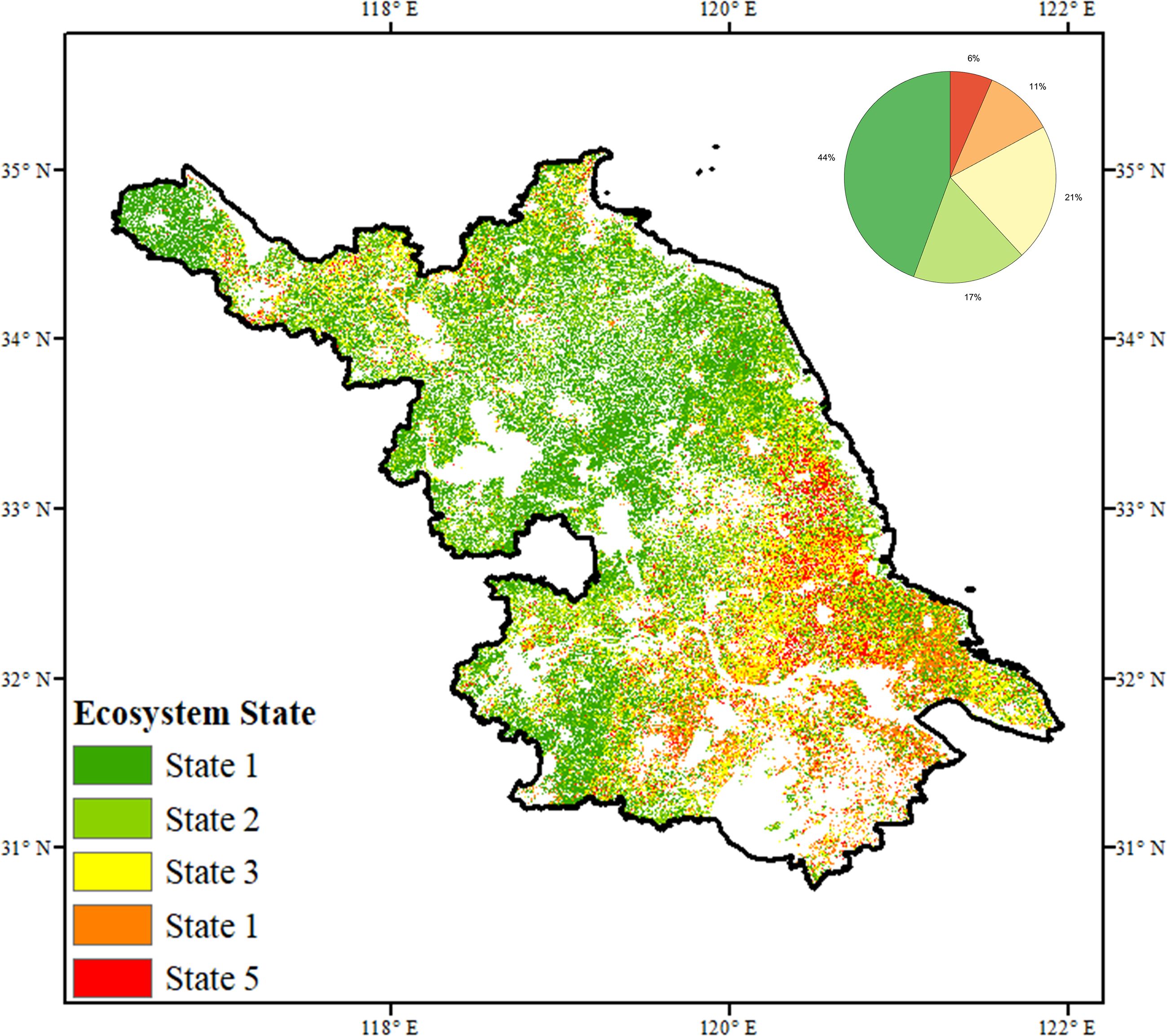 Figure 7. Spatial patterns of the ecosystem state through coupling between the ecosystem functioning (ΔkNDVImax) and ecosystem stability (ΔAR PV) over Jiangsu province.