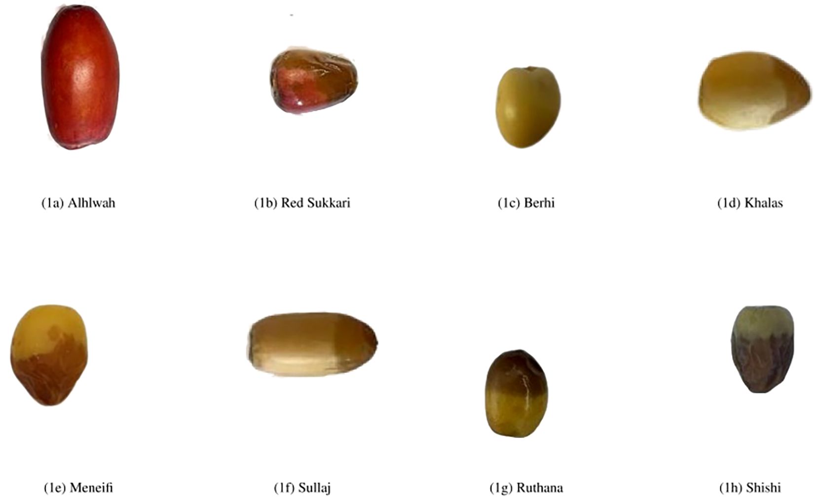 Most of the existing research in the domain of date fruit classification focuses on the final stage of dates and neglects the “Rutab” stage, which is the middle stage of date development between the Tamar (final) and Khalal (immature) stages (Altaheri et al., 2019). This gap is significant because many Rutab varieties share highly similar visual characteristics (such as color, shape, and texture), making them much harder to distinguish. In contrast, studies targeting other ripeness stages or more visually distinct classes often face a less challenging classification problem. In this paper, we aim to address this gap by using advanced machine learning techniques to classify “Rutab” dates. To achieve this, we created our own dataset specifically for “Rutab” dates, focusing on eight widely consumed varieties: Khalas, Sullaj, Alhlwah, Red Sukkari, Barhi, Ruthanah, Meneifi, and Shishi. Figure 1 illustrates representative samples from each variety. In total, the dataset includes 1659 labeled images, ensuring a balanced representation across all eight Rutab types for training and evaluation purposes.