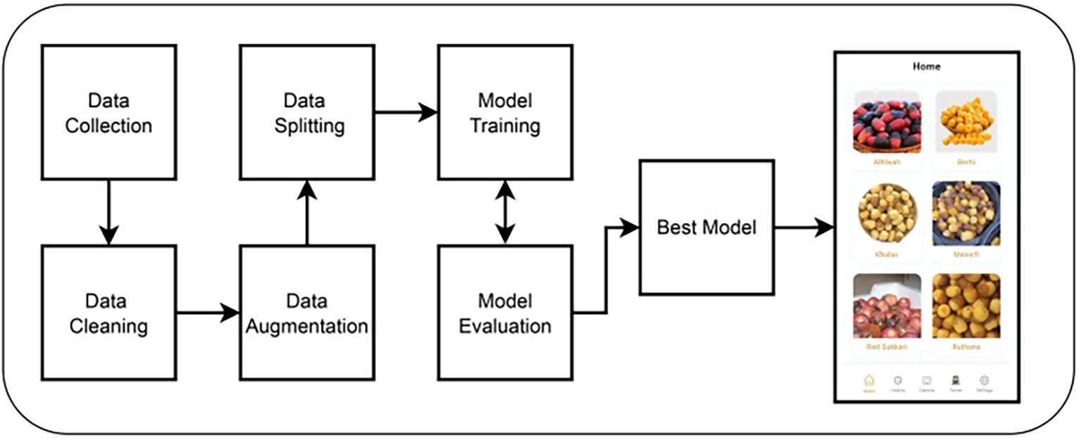 Our approach to classifying Rutab date varieties involves a multi-stage pipeline, as illustrated in Figure 2. The process begins with the construction of our own custom dataset, which we collected manually under controlled conditions. Following data acquisition, we applied a series of preprocessing steps. These included cropping to isolate the date fruit and resizing the images to a standardized input dimension suitable for deep learning models. To enhance model generalization, we employed various data augmentation techniques such as horizontal flipping and random rotation. The dataset was then partitioned into training, validation, and testing subsets using a stratified split to preserve class distribution across sets. Subsequently, we fine-tuned several state-of-the-art deep learning architectures, including CNN, YOLOv8, ResNet50, EfficientNetB0, and YOLOv12. The best-performing model—YOLOv12 in our case—was selected for integration into a mobile application designed for public use, enabling users to classify Rutab dates in real time. The following sections provide detailed descriptions of each step in our methodology, including dataset collection, data cleaning, data augmentation, data splitting, model training, model evaluation, and mobile development.